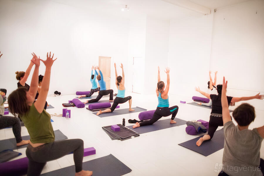 It features a reverse cycle split system air conditioner (heating or cooling), dimmable lighting, yoga equipment such as yoga mats, bolsters, blankets, yoga straps, and 30 white chairs.