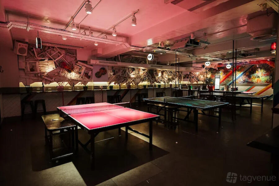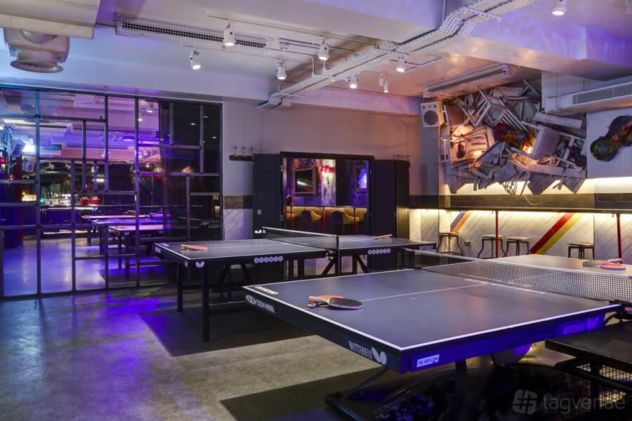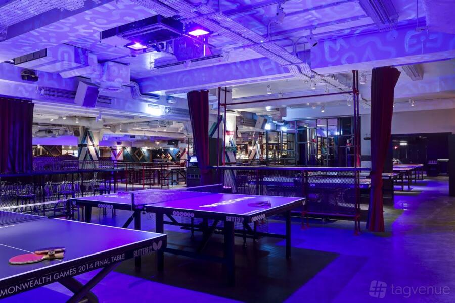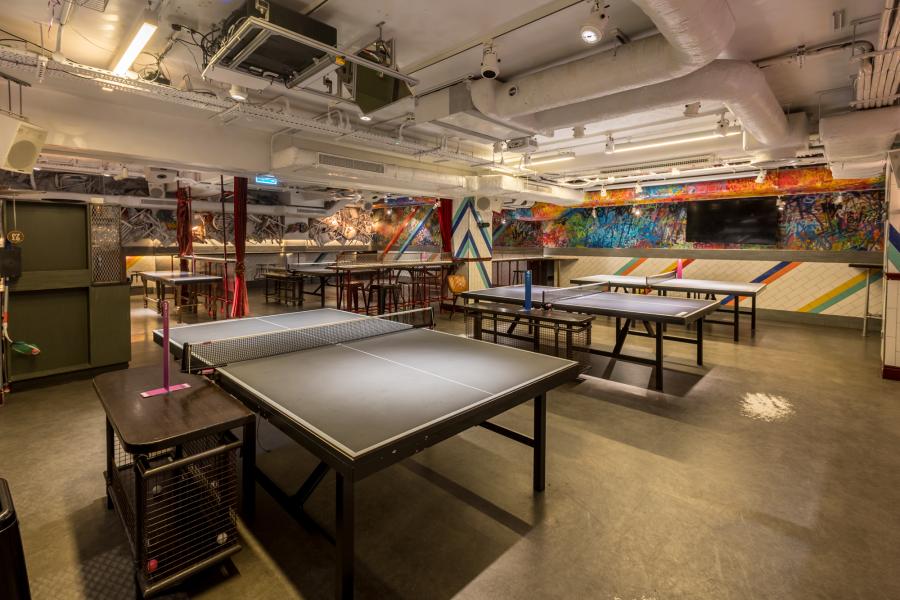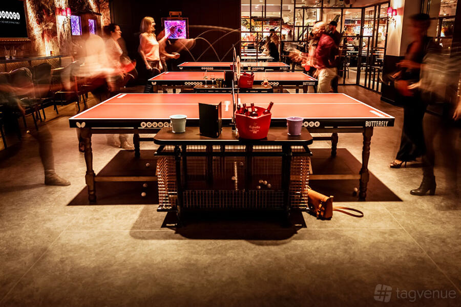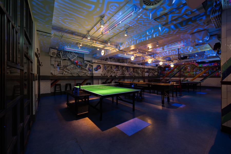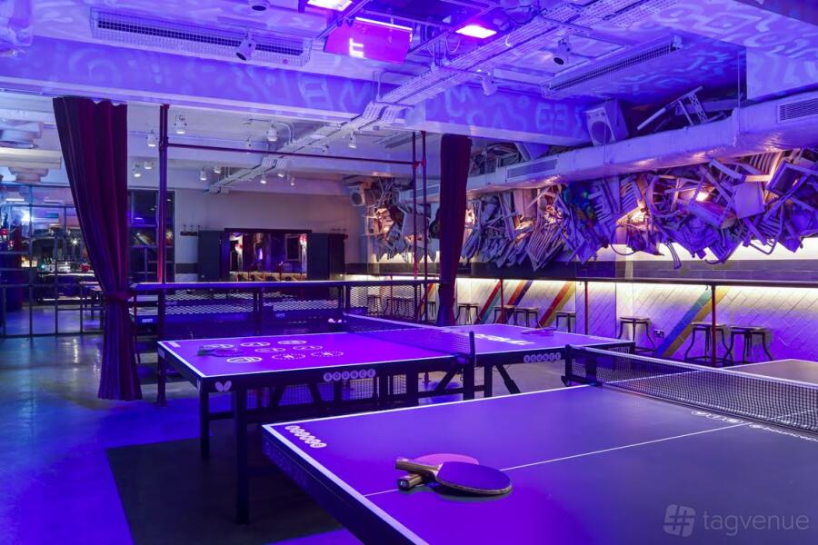 Three Ping Pong tables and a Beer Pong table - Private cocktail bar, mixologist & bar seating - In-house music of your own choice - UV lighting and iridescent artwork - 40” LCD screen & 7ft projector