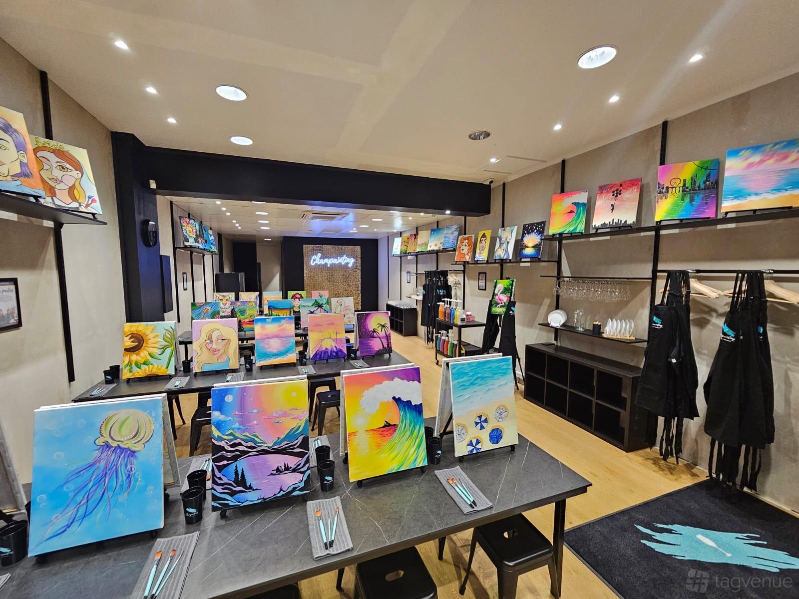 Champainting Berwick has a bright and creative atmosphere, perfect for painting and having fun. The studio is filled with colorful artworks on the walls. Long tables are set up with canvases and painting supplies. There are also shelves with paint bottles and brushes neatly organized, ready for everyone to use.