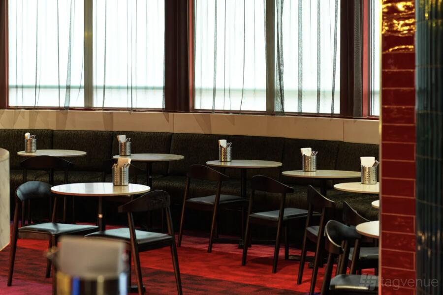The area is positioned underneath a round wall of windows and features chairs for a total of 50 people, arranged at ten tables. The seating area with a long and cozy banquette that forms the room is very welcoming and creates a social atmosphere ideal for dining and cocktail receptions. The space is right next to the main bar.