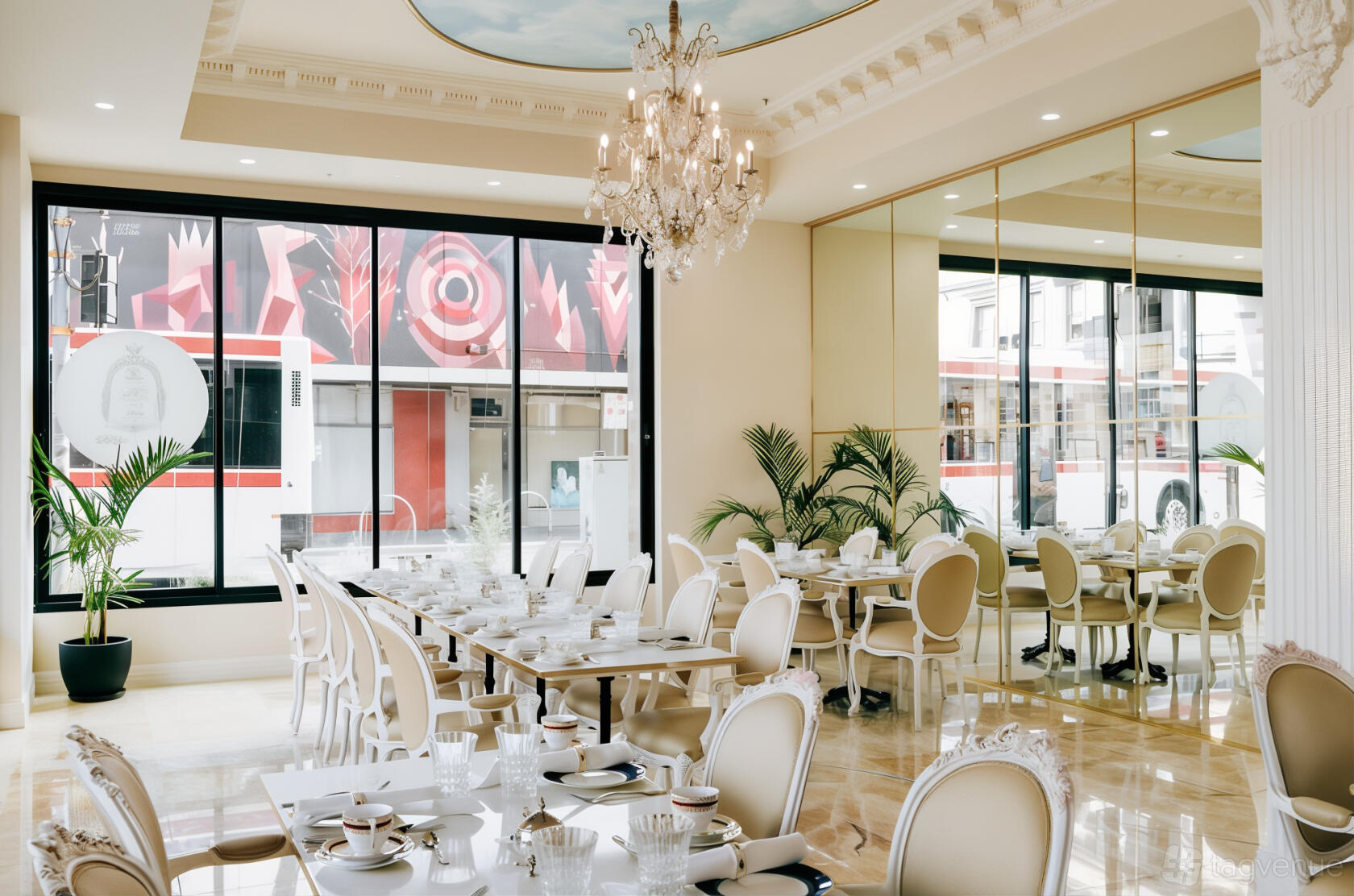 The Third Tier, nestled in the heart of Melbourne’s trendy Brunswick East, is a luxurious high tea venue that is filled with elegance and charm. This custom-built venue offers an escape from the bustling city, with its interior featuring Renaissance-style mirrors, blue statement walls, and marble flooring. The décor is a combination of art deco and Parisian tea room motive. The stunning sky mural on the ceiling and the sparkling chandelier add to the venue’s elegant atmosphere, making it a perfect setting for any special occasion.