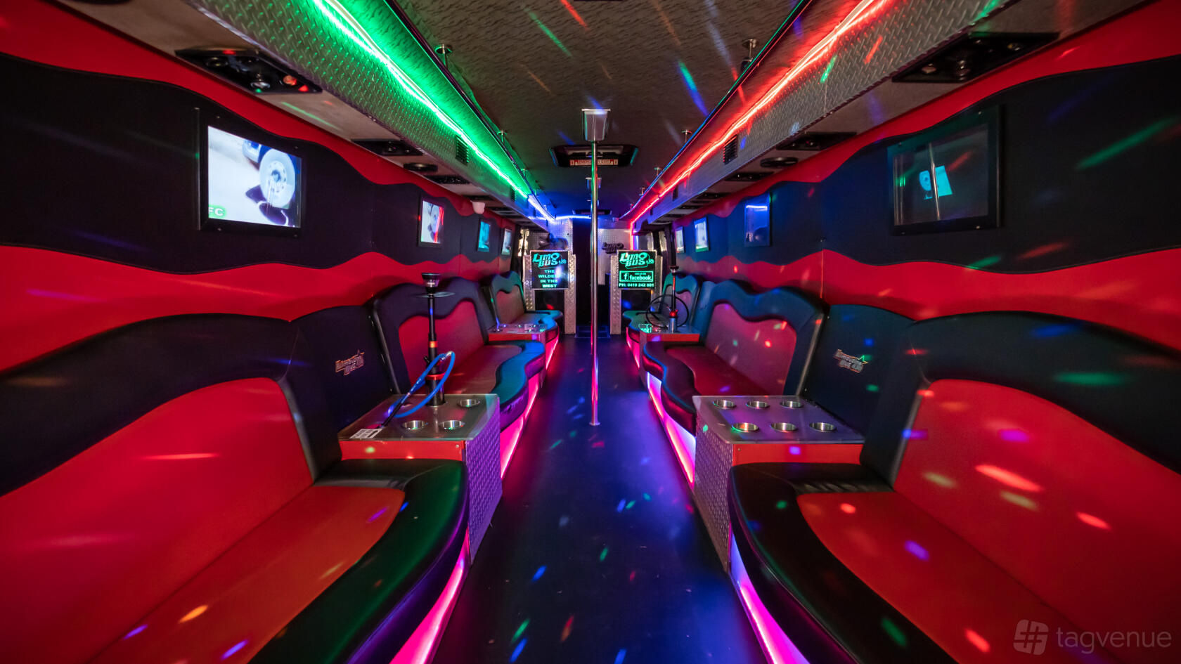 The Shisha Bus offers a vibrant and immersive party atmosphere, complete with comfortable lounge-style seating, dazzling LED lighting, flat-screen TVs, and built-in shisha stations for a luxurious experience.