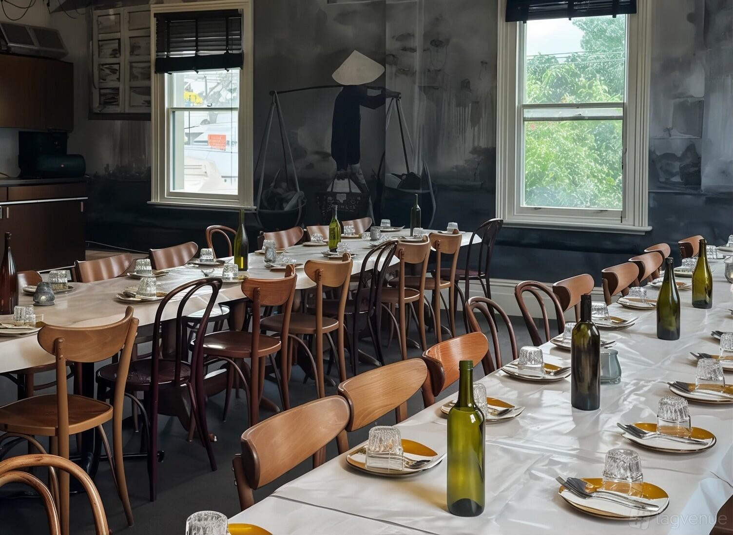 The upstairs area at The Saigon Secret offers an elegant and intimate setting, accommodating up to 60 guests. Featuring vintage-style wooden chairs, long banquet tables, and striking wall murals, this space combines a sophisticated yet warm atmosphere.