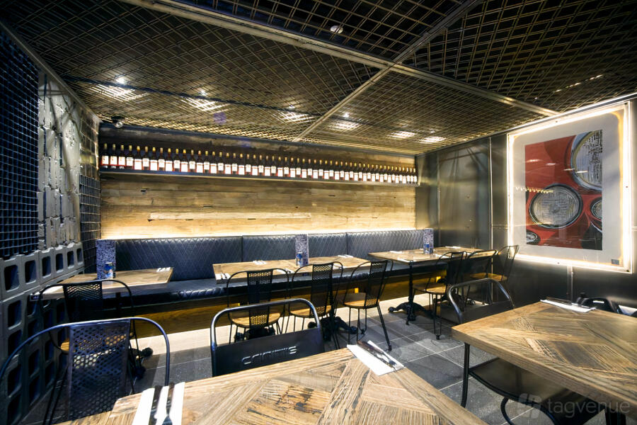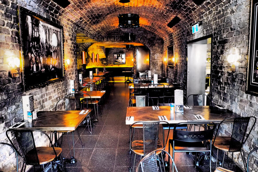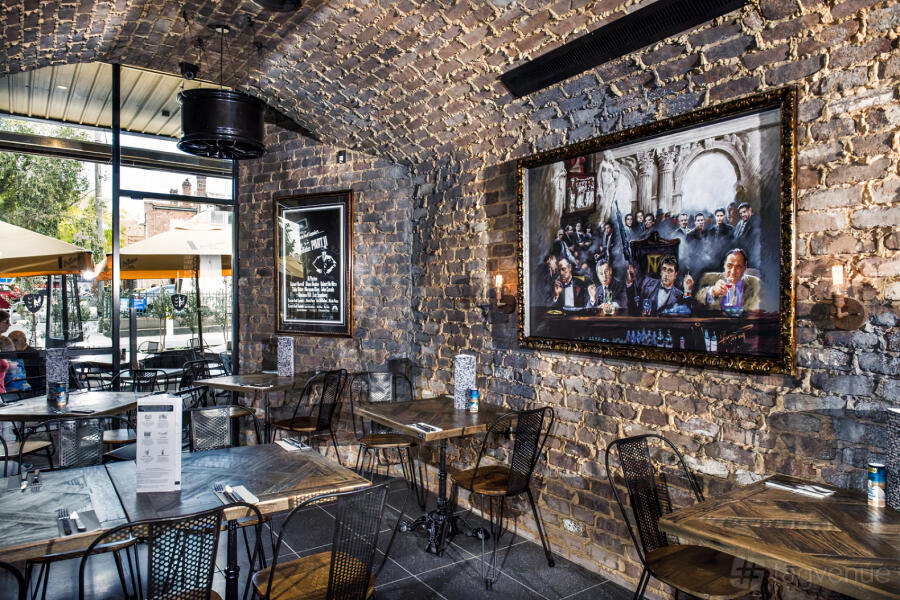 Criniti's Carlton's main dining room is a welcoming space that comfortably accommodates up to 50 guests. The room features white walls, high ceilings, and large windows that let in plenty of natural light. Warm lighting and unique decorations, such as motorcycles and Nutella jars, add a touch of charm to the elegant setting. Easily arranged wooden tables offer a versatile and practical solution for different group sizes and events.