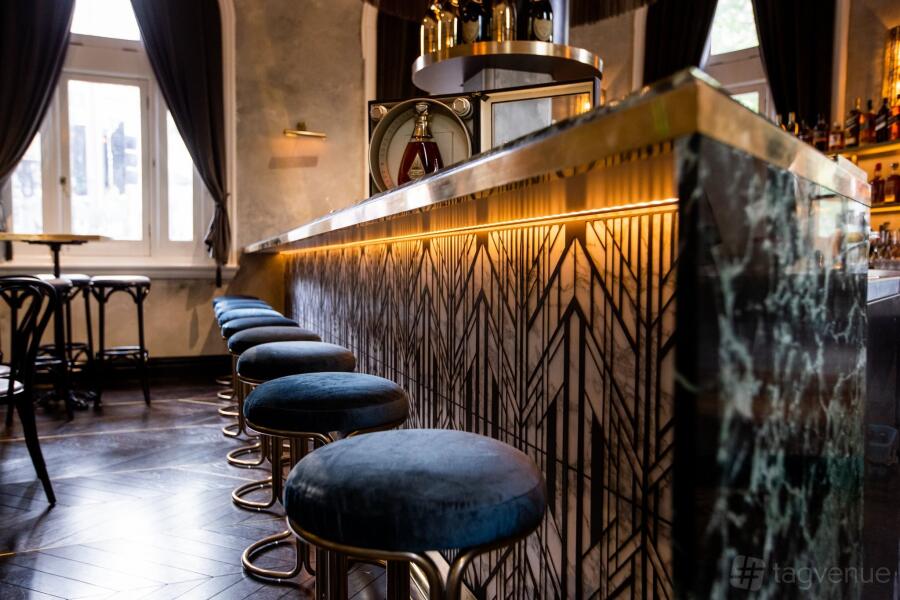 The Butcher's Library is a moody alclave that mixes glamour and danger. With its dark wood and brass fittings, long marble table, and soft, subtle lighting, The Butcher's Library is a space that is both elegant and unsettling. A closer inspection will reveal images of the 1920s underworld, with cut-throat razors, cellared wines, and aging meat behind the surrounding glass.