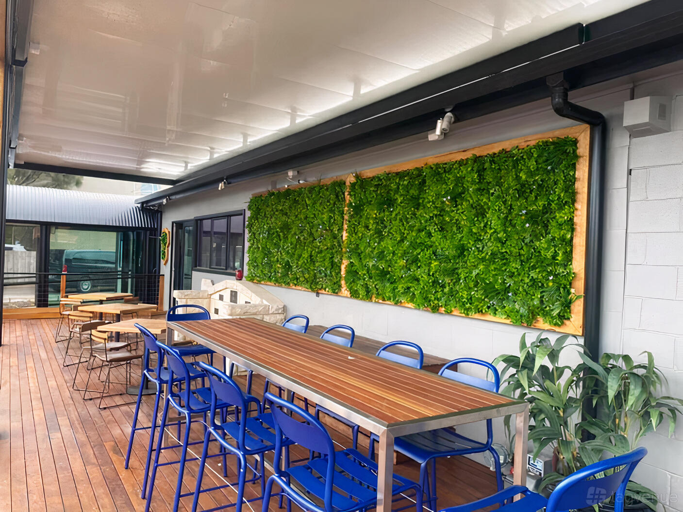 The semi-private dining area is a part of our deck. This space is intended for smaller gatherings, up to 20 guests. We offer a large, roof-covered dining table, surrounded by greenery. For colder weather and evenings, we provide patio heaters, so don't hesitate to plan an event under the stars with us.