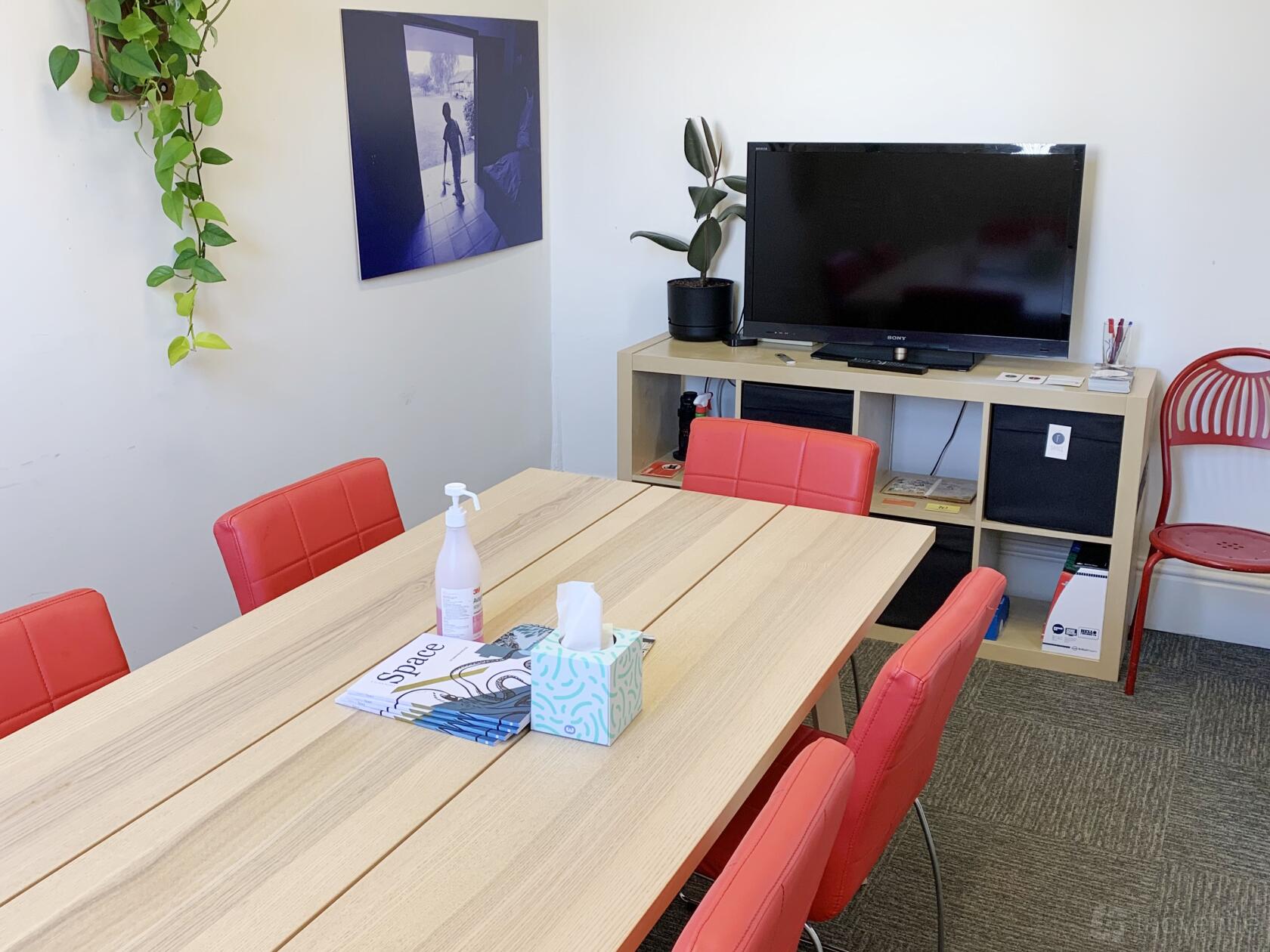 The meeting space is designed to facilitate vibrant and productive discussions, featuring a contemporary aesthetic with minimalist decor. The room is outfitted with a sturdy, light wooden table, flanked by stylish red chairs that add a pop of color to the neutral palette.
