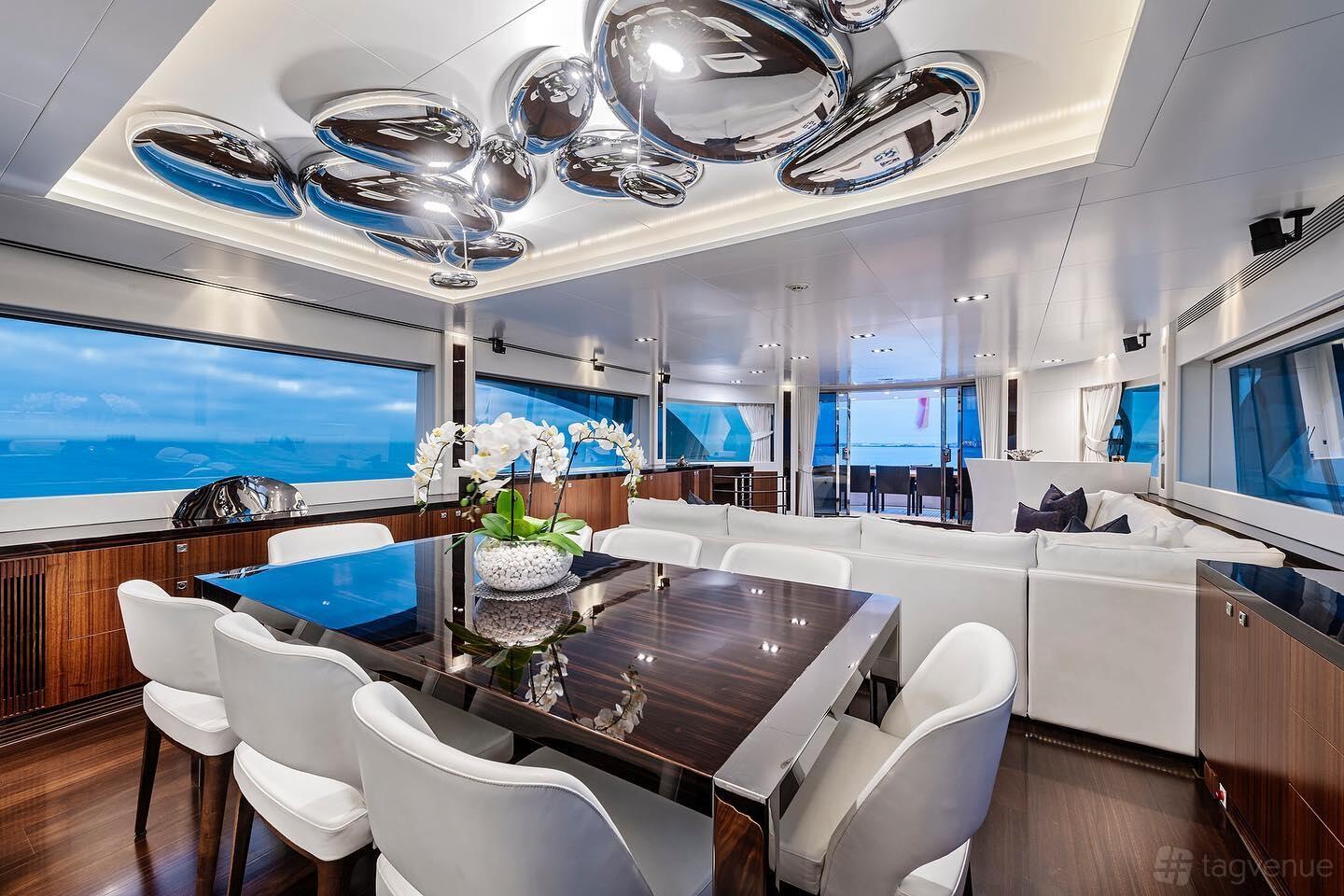 Inside, the saloon boasts a modern and spacious design with plush seating, large windows, and an inviting atmosphere, providing the ideal setting for gatherings or unwinding in style.
