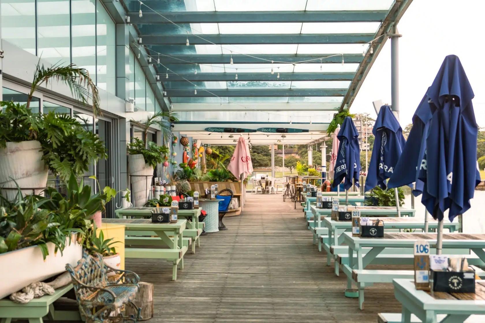 The Captain’s Deck at Drifters Wharf offers an inviting, open-air space perfect for cocktail-style events, combining comfort with scenic views over Brisbane Waters. The spacious deck features a blend of seating and standing areas, including newly renovated VIP booths, all under a sleek glass roof that keeps guests comfortable in any weather.
