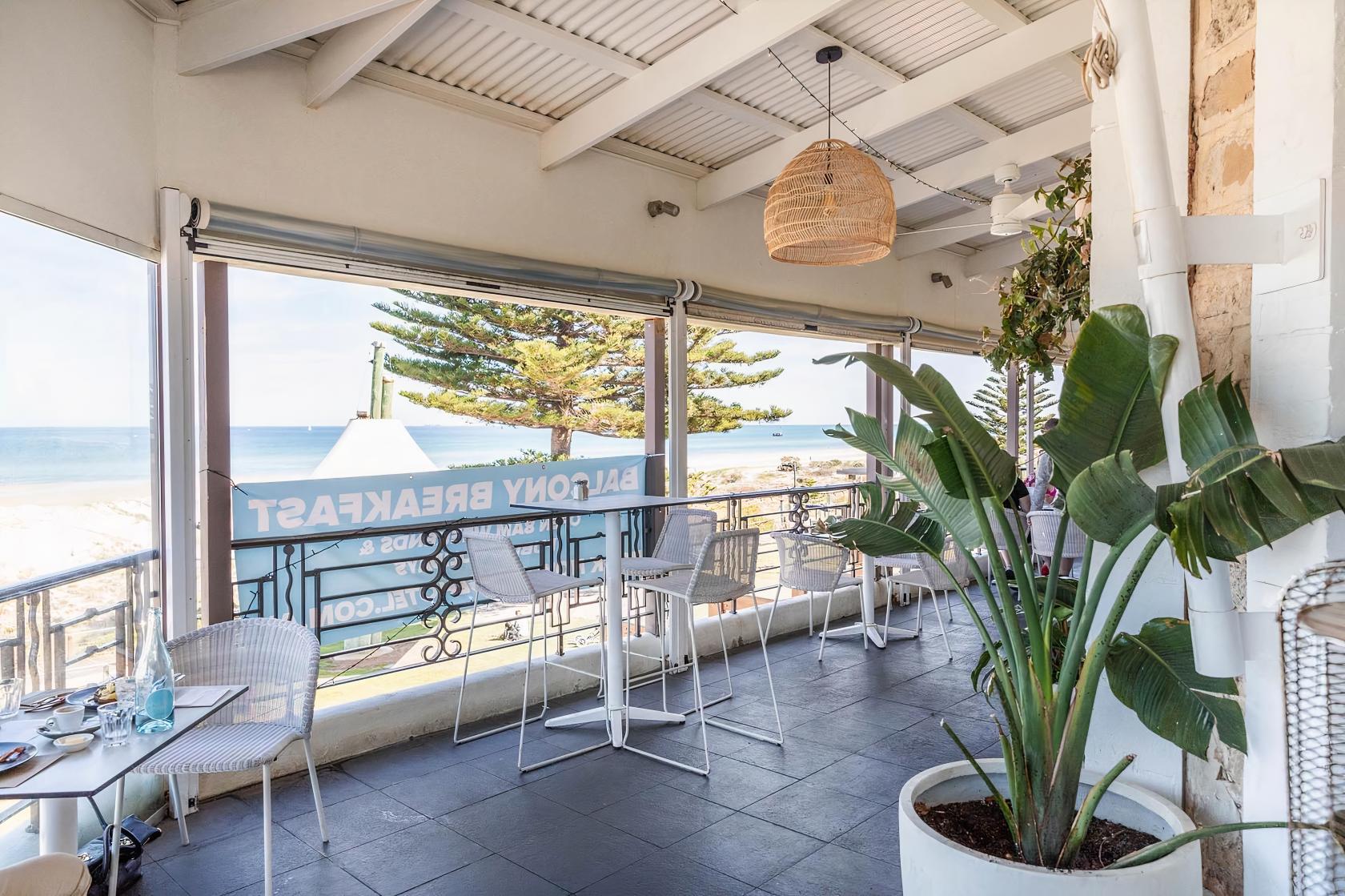 Located at 489 Esplanade, Grange SA 5022, the upstairs area and balcony span approximately 250 sqm, featuring white furniture, greenery, a semi-open layout, and abundant natural light.
