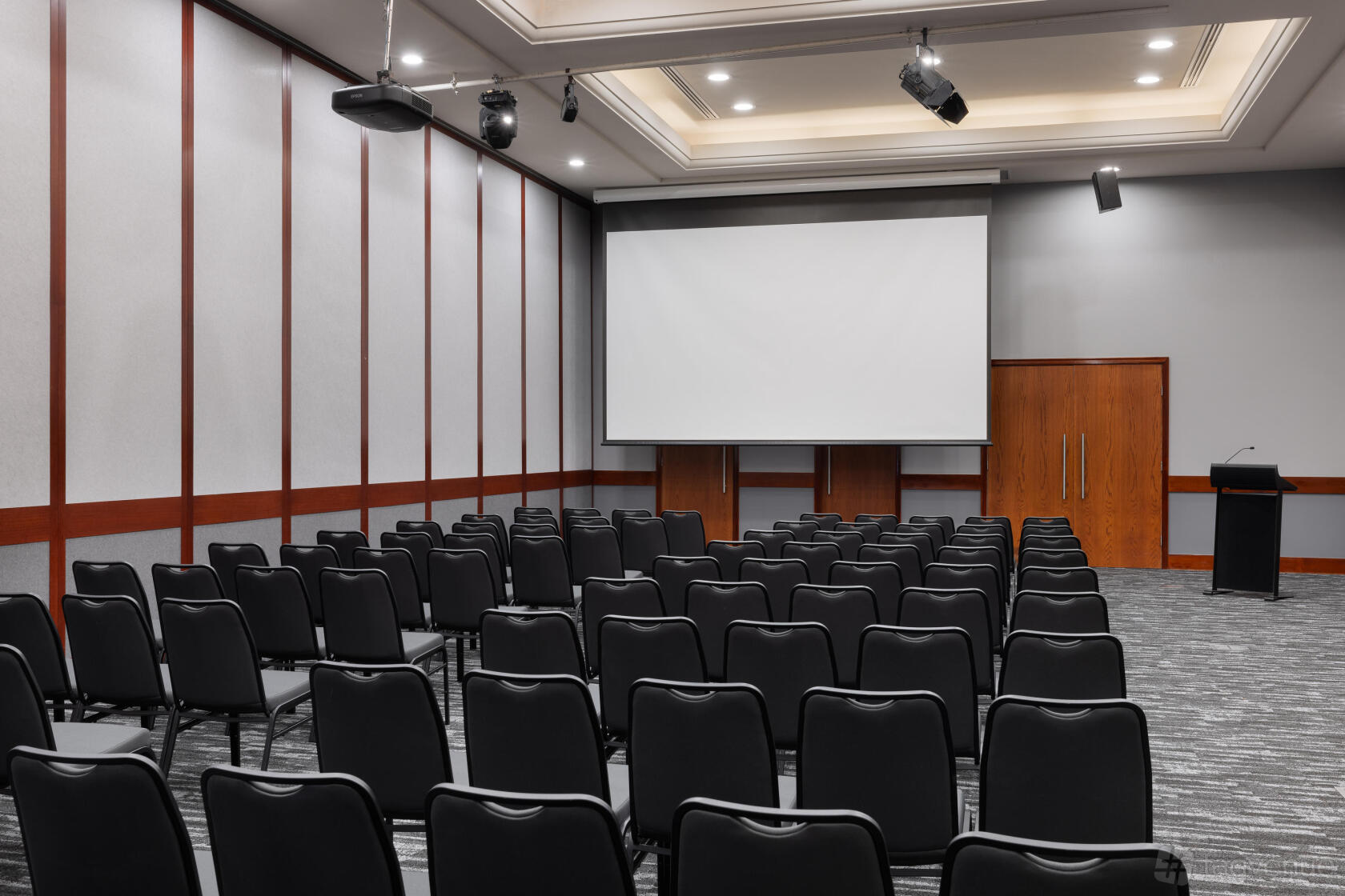 Conference Room 2 offers a premier space for various type of events. This pillarless venue provides a comfortable setting for up to 180 guests in a theater style layout. Thanks to that, it is perfect for big conferences, meetings, or presentations. Whether it's a corporate event or a dinner for 110, this space is tailored to meet your needs.