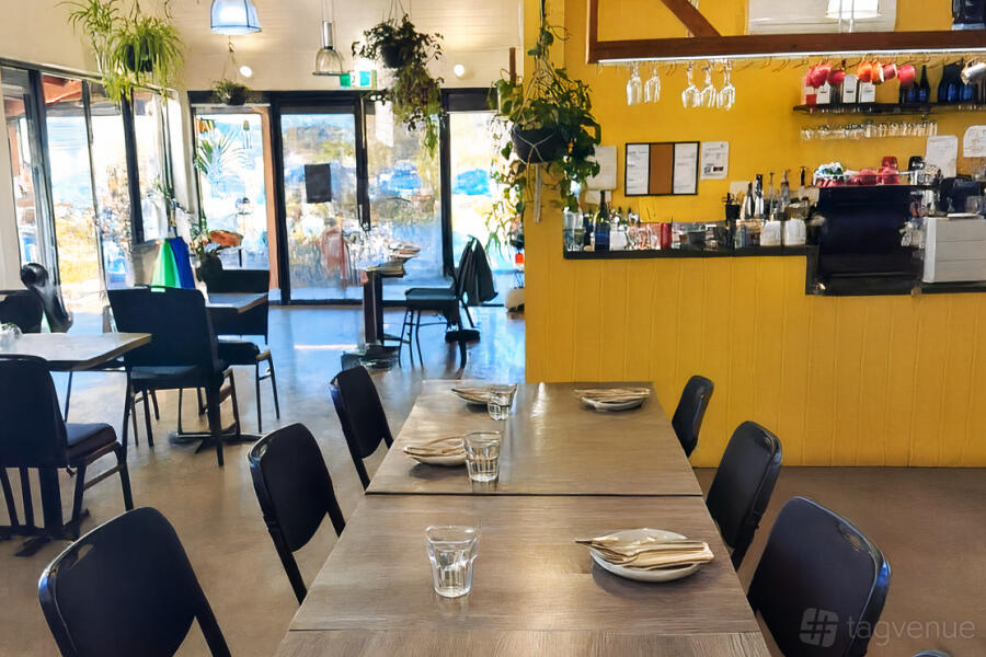 This lively and hospitable place gives a delightful vibe for a maximum of 100 people, mixing bright interiors with a lovely adjoining open-air. The major dining room is under the sun, coming up with natural light, emphasizing the yellow walls, hanging plants, and fun design elements which all contribute to a warm and lively atmosphere. The vaulted white ceiling and open layout magnify the airy sensation in the room, hence, the space is not only large but also all the more inviting.