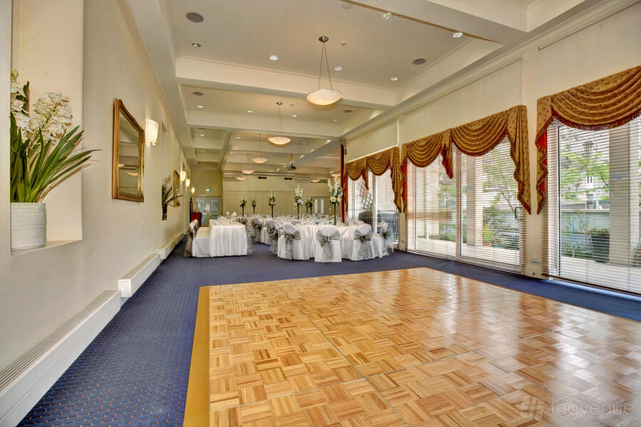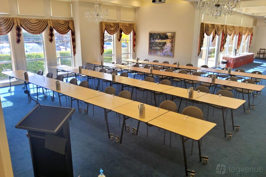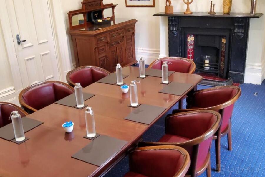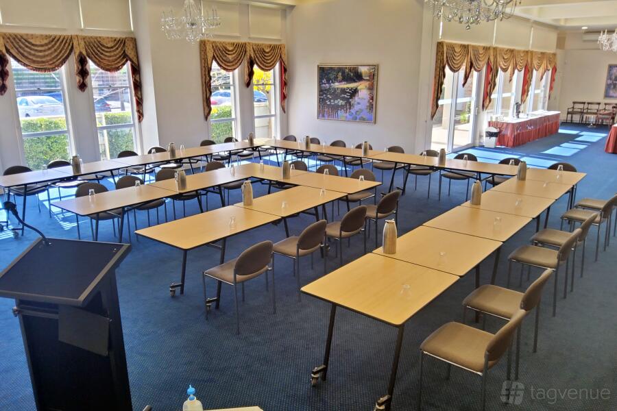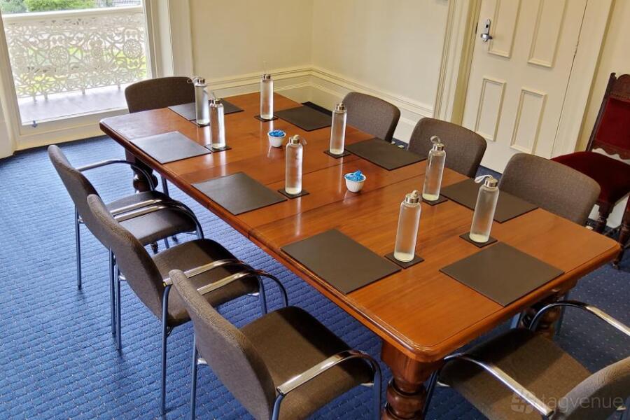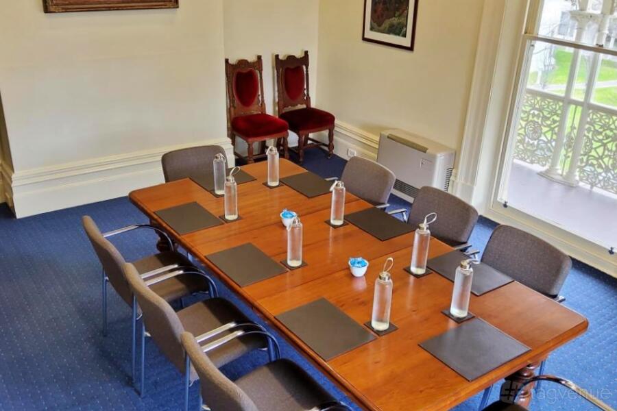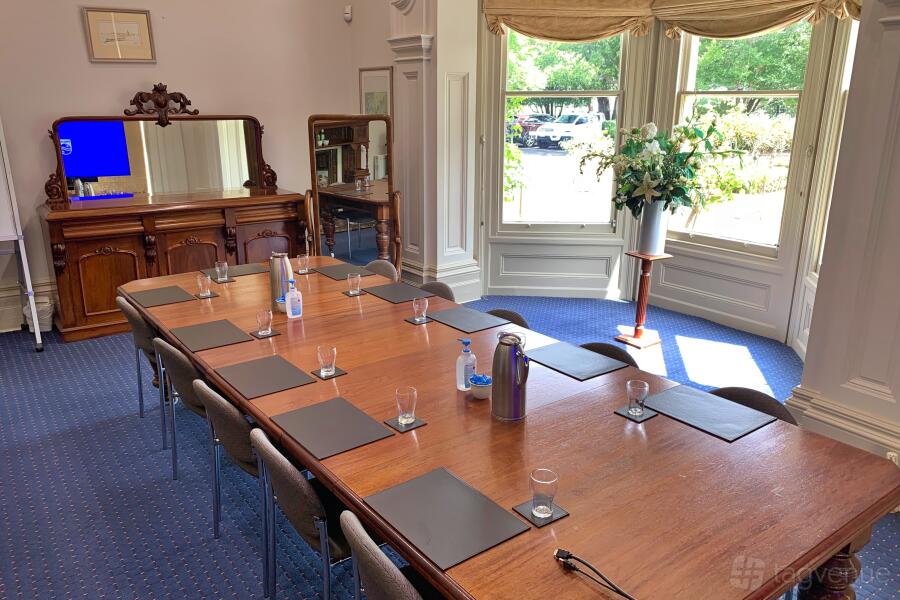 Three large windows let sunlight in and overlook the gardens below. This room easily accommodates up to 50 people setting theatre-style or up to 30 people at round tables.