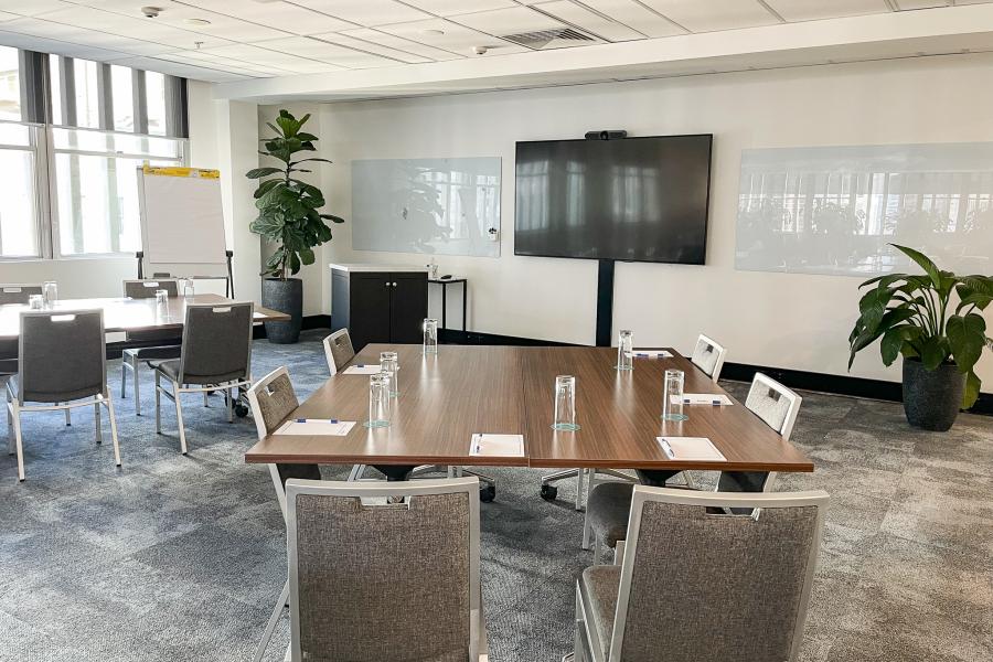 Room B meets the needs of today's corporate gatherings, such as conferences and meetings. It features a whiteboard and a 65" TV screen to keep your team members on the same page.