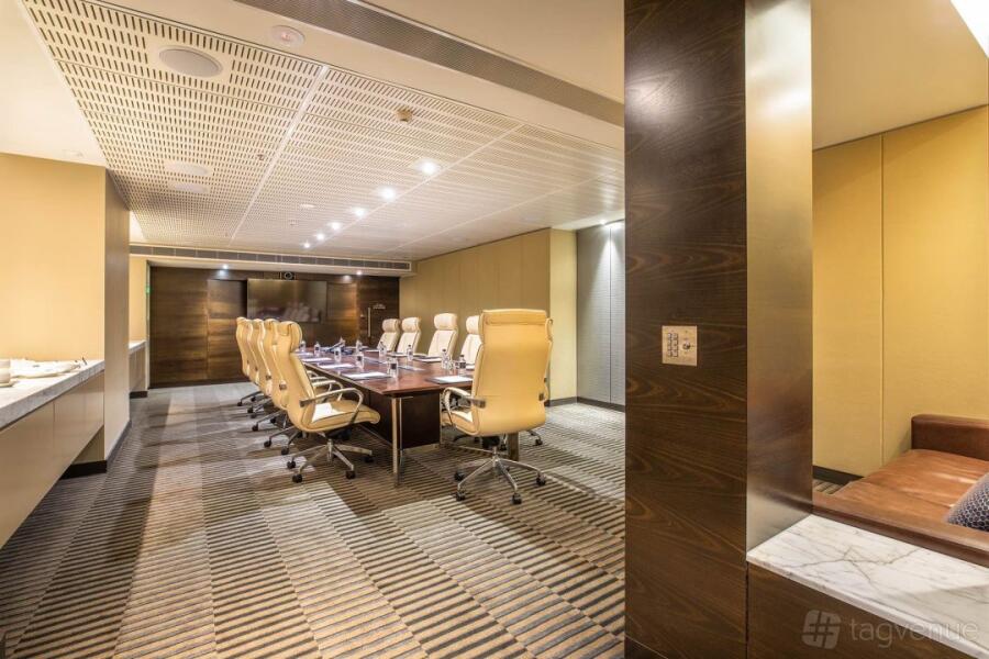The space is ideal for conferences, off-site, business meetings, or team building. The interior is designed in a serious style - some wood is added, long curtains, paintings, and a beautiful carpet.