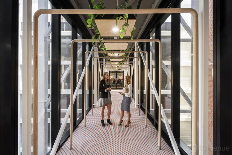 Spanning five levels, the space features an external link bridge to the center, mothers’ room, private phone booths, collaboration corners, and event spaces to spur creativity and further encourage collaboration opportunities among members.