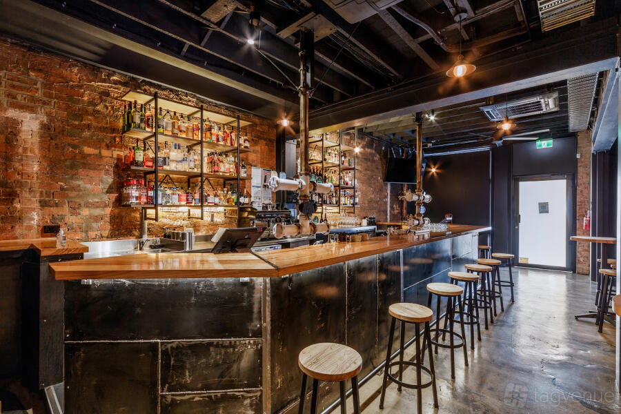 The Downstairs immerses you in rugged rustic allure. Exposed red brick walls, black steel, and wood accents, polished concrete floors, and an open ceiling create an intimate, industrial ambiance. The fully stocked bar entices guests with a wide selection of cocktails, while a discreet stage sets the scene for live performances that will keep you thoroughly entertained.