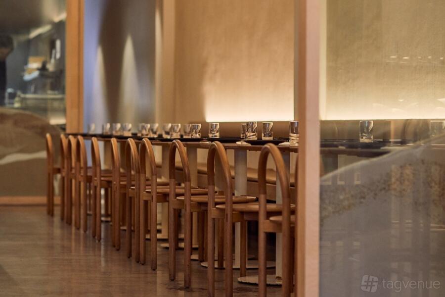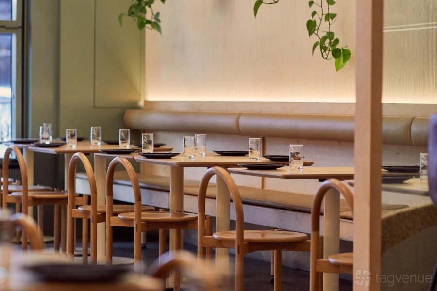 The main dining room with a calm and moody atmosphere runs parallel to the bar and offers a perfect setting banquet style dining for large group events.