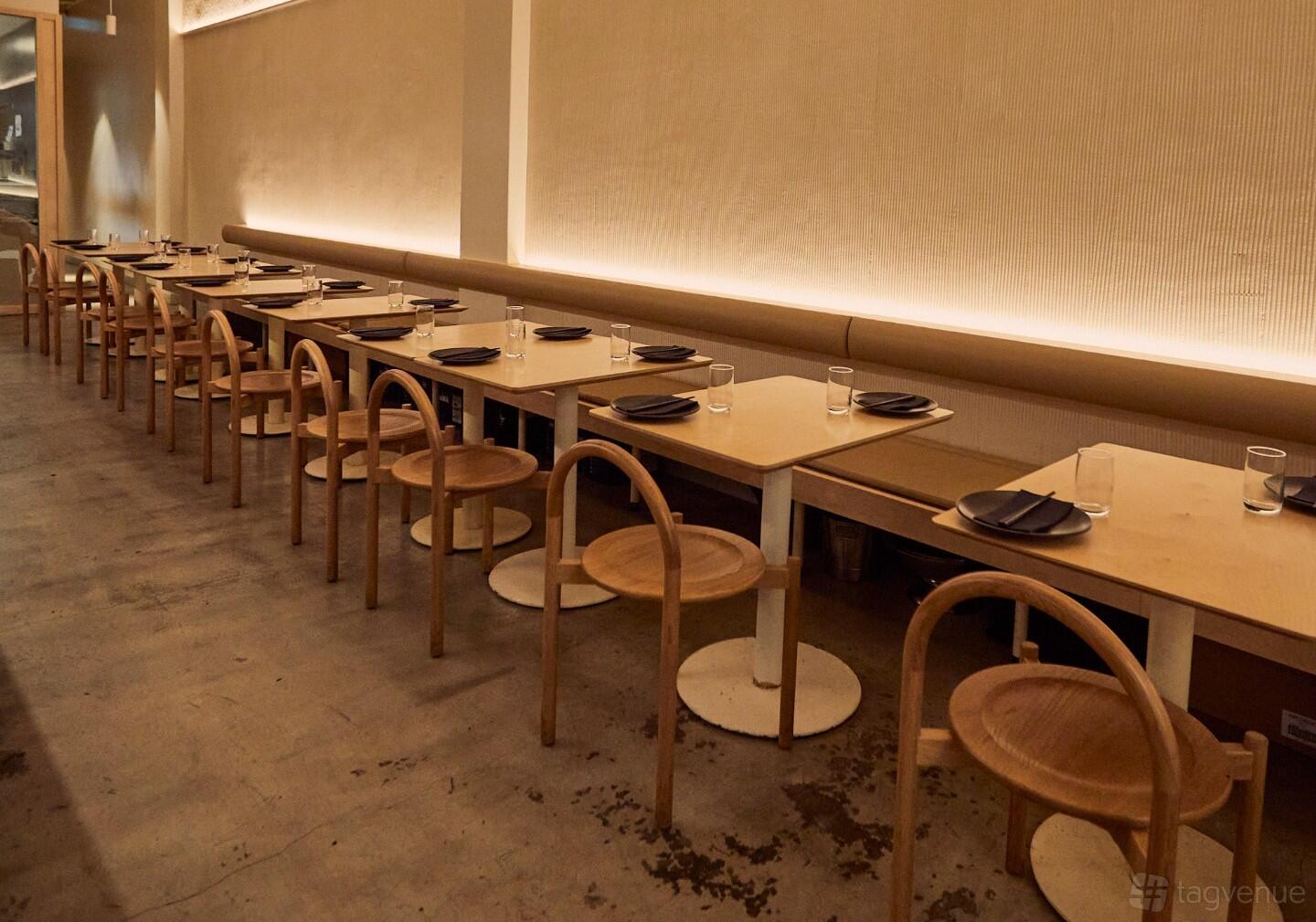 The main dining room with a calm and moody atmosphere runs parallel to the bar and offers a perfect setting banquet style dining for large group events.