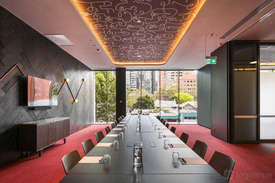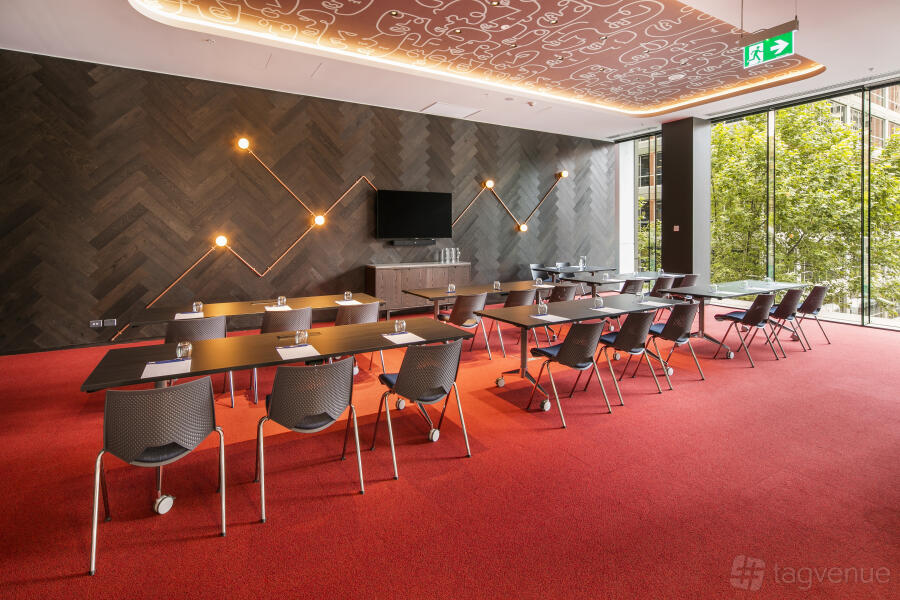 The decor features vibrant red carpeting, sleek dark furniture, and unique ceiling designs that add a touch of contemporary flair. The room is equipped with state-of-the-art audiovisual equipment and high-speed internet, ensuring seamless presentations and communications. The St Augustine Room is ideal for businesses or organizations seeking a professional and stylish setting for their events, offering a perfect blend of functionality and aesthetics to create a productive and engaging environment.