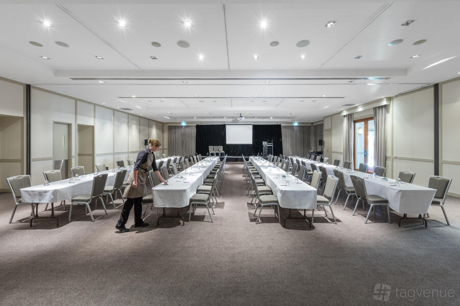 A distinctive difference of this event space is the concealed doorway leading into the hotel Lodge Bar where guests can mingle in between or after the function.