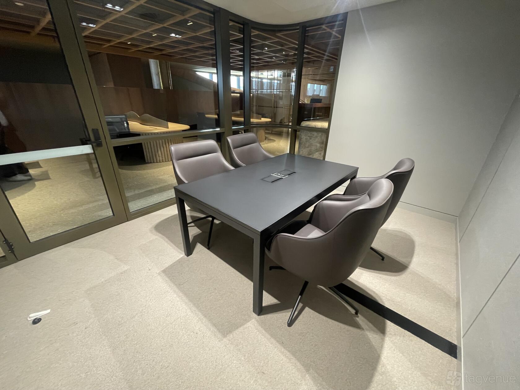 Room includes access to Wi-Fi connection, printer, TV monitor for presentations, tea/coffee pods, filtered water & sparkling water, showers, and equipped with high-quality ergonomic office chairs for comfort and support.