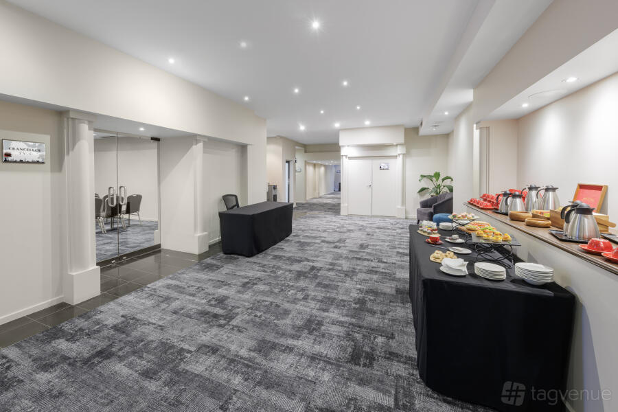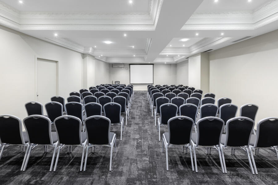 Chancellor Three & Four, our medium-sized conference space, can host up to 80 guests in theatre-style seating, making it ideal for seminars and substantial workshop gatherings. It features reverse cycle air conditioning and a retractable projector screen, and we're flexible in adjusting the room's arrangement, seating, and facilities to meet your requirements. The space also features a retractable wall, allowing the room to be separated into two smaller spaces and ideal for breakout spaces.