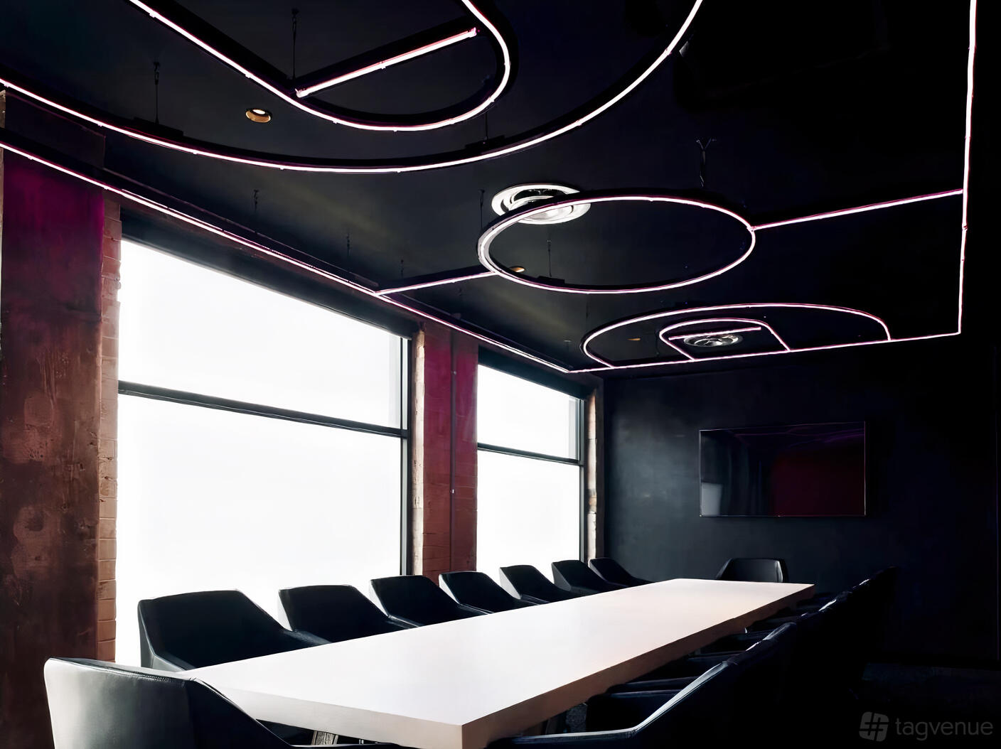 The Courtside Room is a modern meeting space with dark walls, a white conference table, and ergonomic chairs. Futuristic LED lighting adds a dramatic touch, while large windows provide natural light.