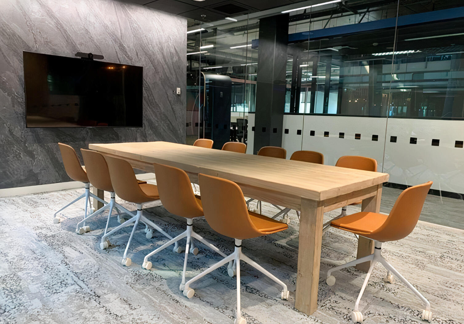 Nemo is a lively meeting space with a rustic wooden table and orange swivel chairs.