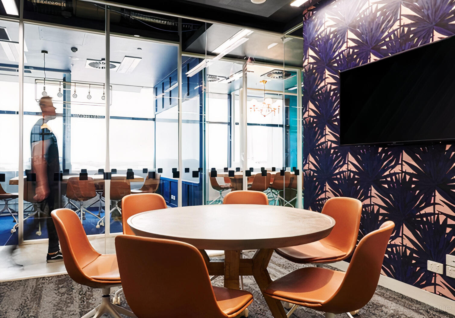 The space features comfortable orange chairs, creating a relaxed yet professional setting, perfect for small group discussions, team meetings, or brainstorming sessions.