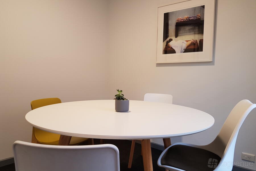 Upstairs at Happy Hubbub, this private office can be used by 1 to 4 people, either to work privately or to meet with clients. The office is 12 sq m. Standard layout is a single desk with monitor, plus round 'meeting table', plus 2-seater couch.