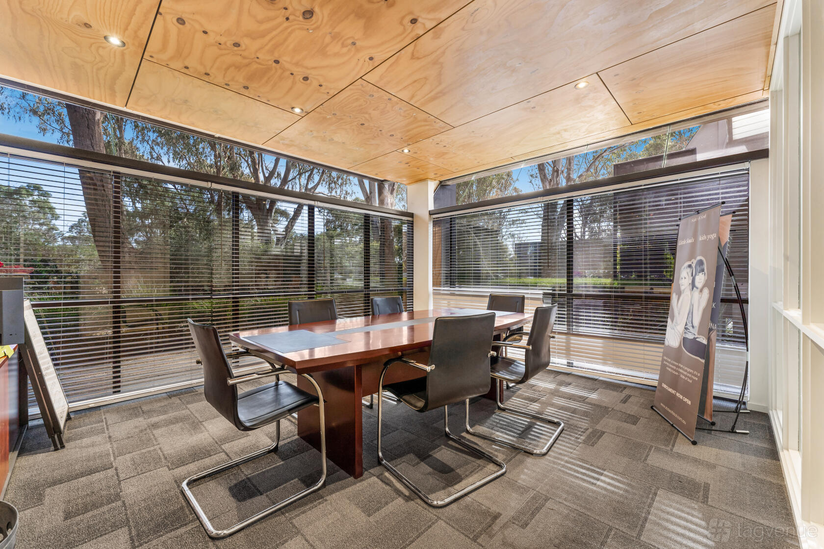 The boardroom features large windows with horizontal blinds, offering a view of lush greenery outside. At the center of the room is a sleek rectangular wooden table, surrounded by modern chairs, comfortably seating up to 6 people. The space is bright and welcoming, with ample natural light streaming in through the windows.