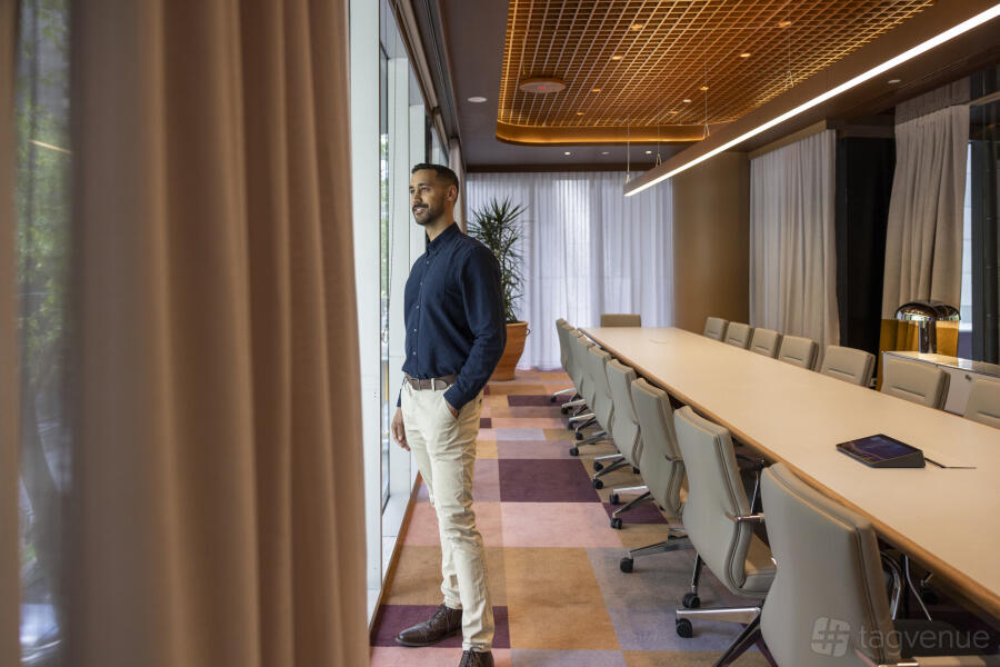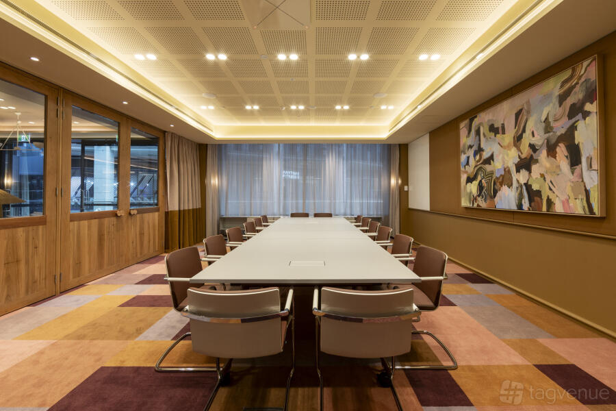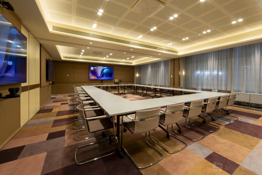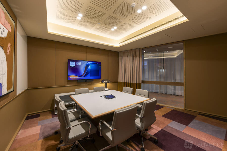 A rectangular conference table with office chairs are positioned in the center of the room. The floor is finished with a decorative carpet design.