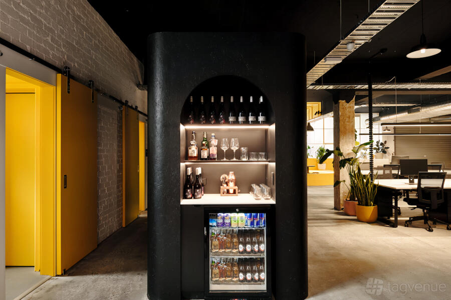 Members enjoy a full kitchen, stocked bar, coffee station, and pet-friendly policies.
