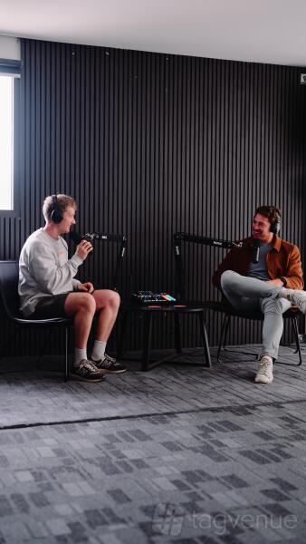 Podcast Studio: With high-end audio equipment, the podcast studio features Shure SM7B microphones, Rode NTH-100 headphones, and a RodeCaster Pro 2 mixer. A complete production lighting suite accompanies the setup to provide a professional setting for podcast recording.