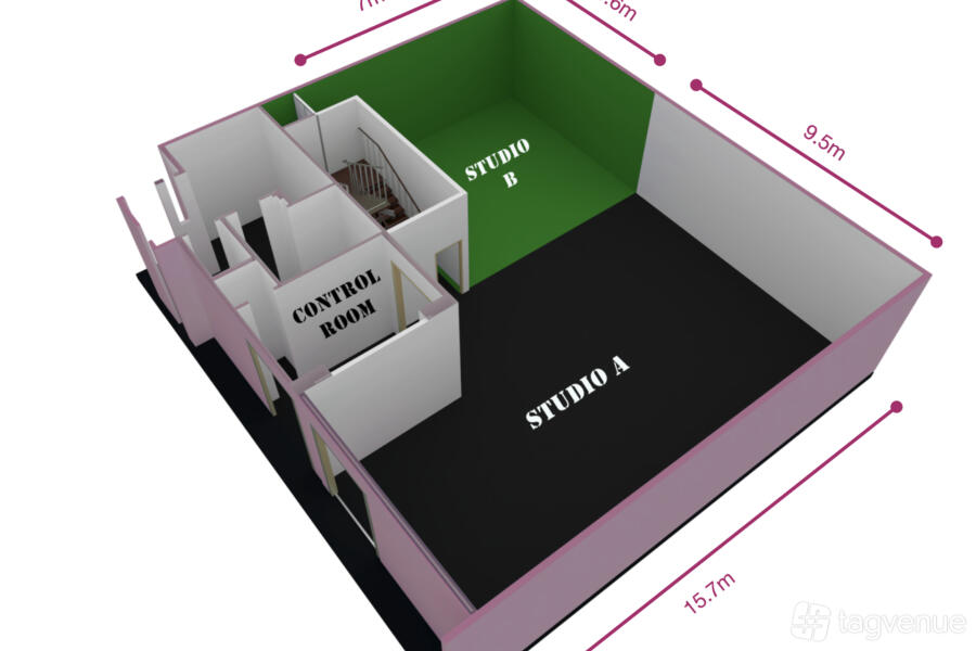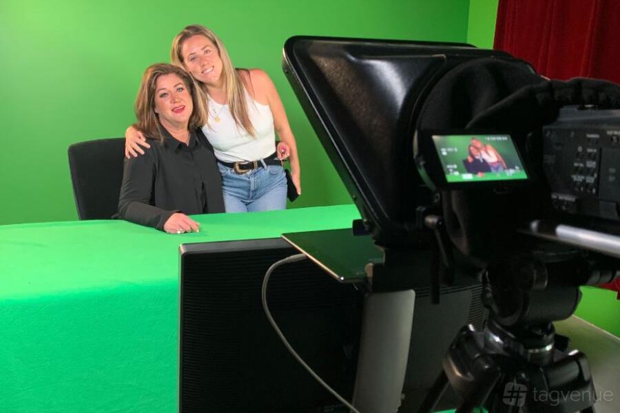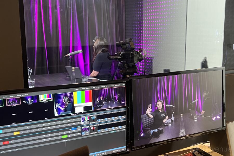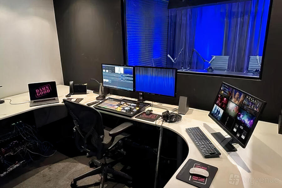 Studio B - a 50 sqm multi-purpose studio. Perfect for audio podcasts, multi-camera streaming, and green screen video recording, complete with a separate control room. Perfect for recording a podcast with 4 people, or conducting video cross-interviews with the green screen behind.