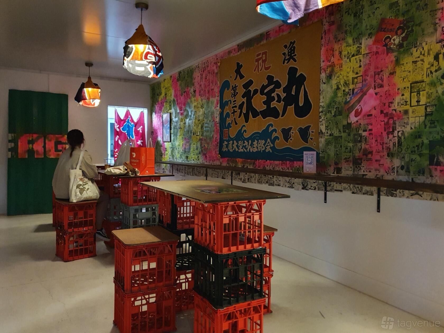 The Japanese Dining Room at EziStreat offers an intimate and authentic dining experience. This cozy space features long wooden tables and red plastic crate seats, creating a casual yet traditional ambiance.