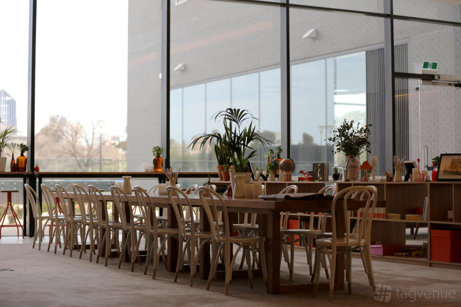 Workshop 1 at The Larwill Studio features high floor-to-ceiling windows, providing stunning views of the Melbourne city skyline and surrounding parklands. This bright, open space offers a versatile setup, making it perfect for various events, from meetings to workshops.