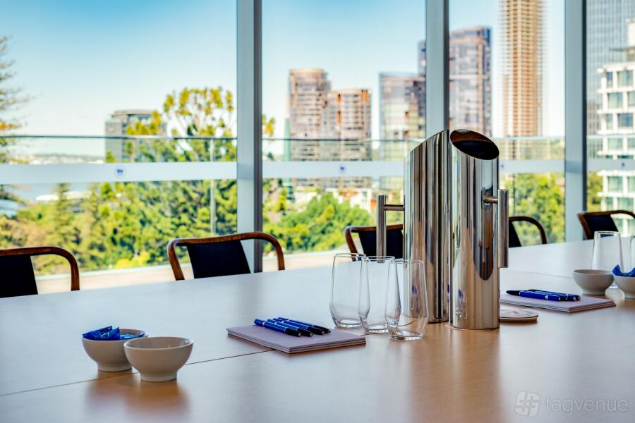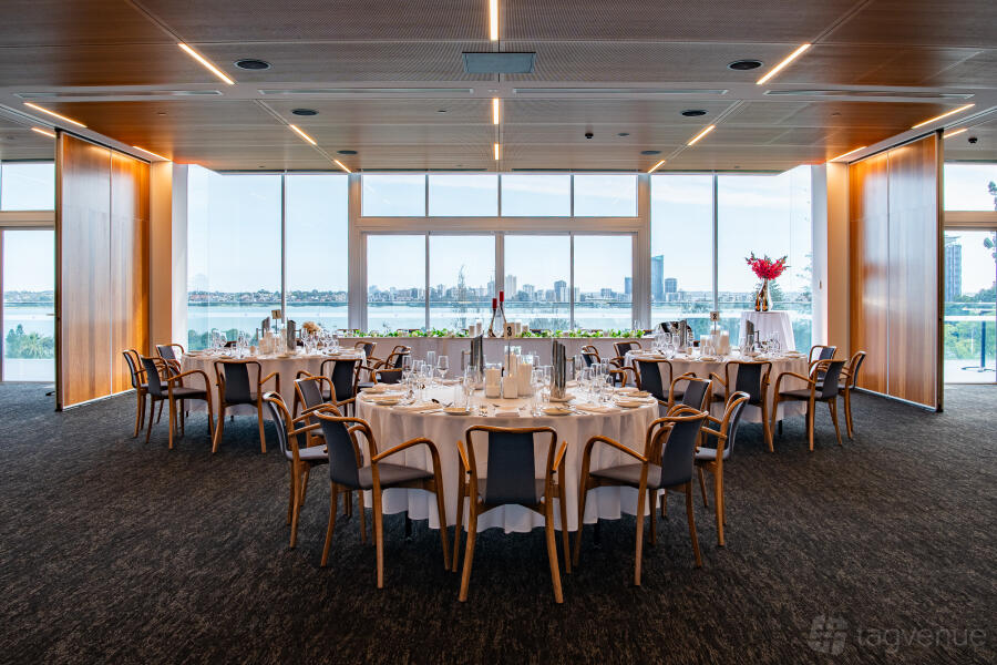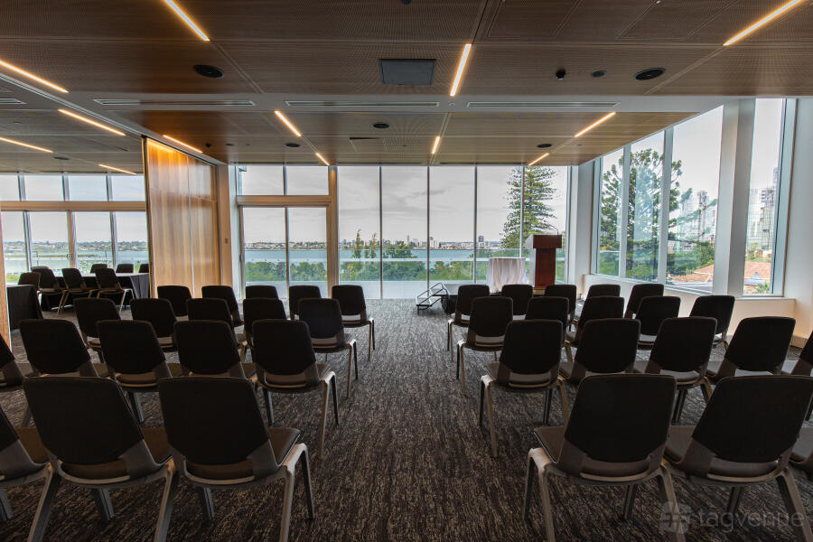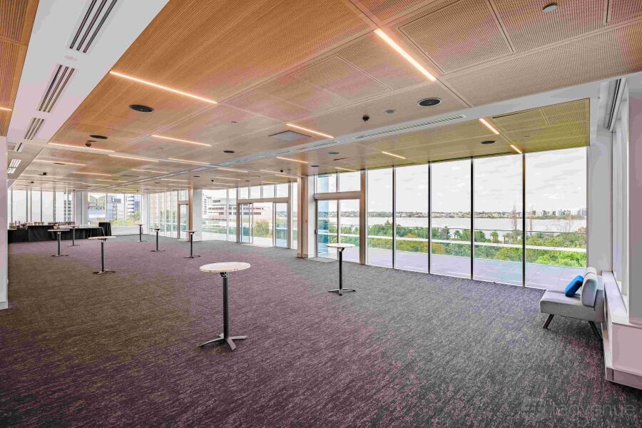 Accents of features, wood finishes, and marble welcome your guests into a pillar-free space with user-friendly audio-visual equipment built into the room. Floor-to-ceiling windows and neutral colours are used, resulting in a beautiful, natural light-filled space, not to mention accessible private balconies with 180° views of Perth.