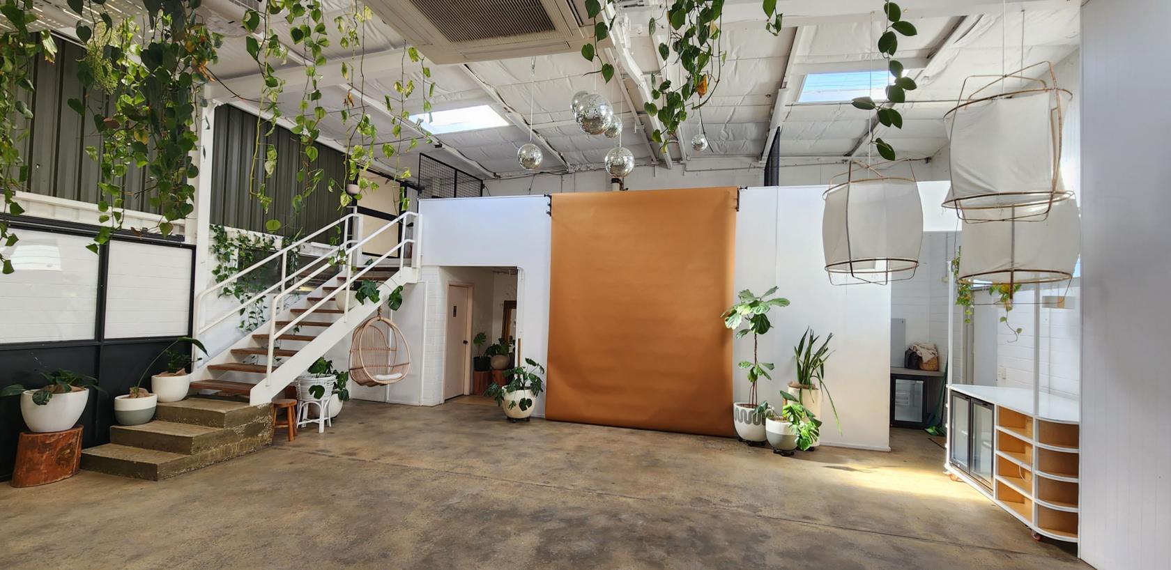 The space seamlessly blends industrial charm with modern artsy decor, creating a captivating space for a diverse range of events. The ambiance is defined by exposed white-brick walls, a polished concrete floor, and a roll-up door that effortlessly blurs the line between indoor and outdoor areas.