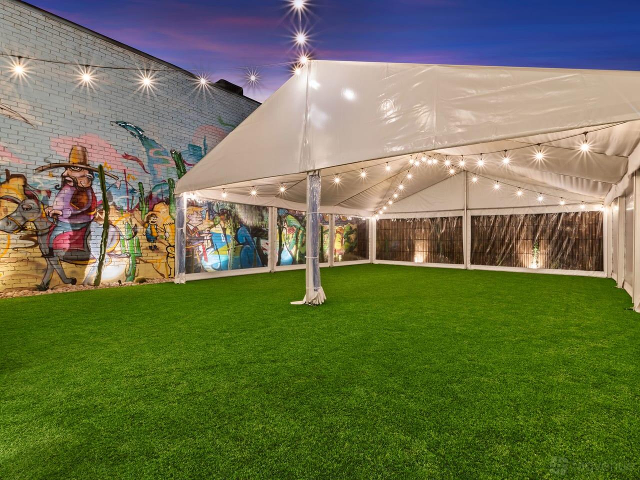 To the read there is a large garden area of around 160sqm with a silk-lined marquee and a stunning graffiti mural. Mood lighting and a cactus garden complete the vibe. Absolute showcase space for a catered event or whatever you have in mind. Use your imagination!