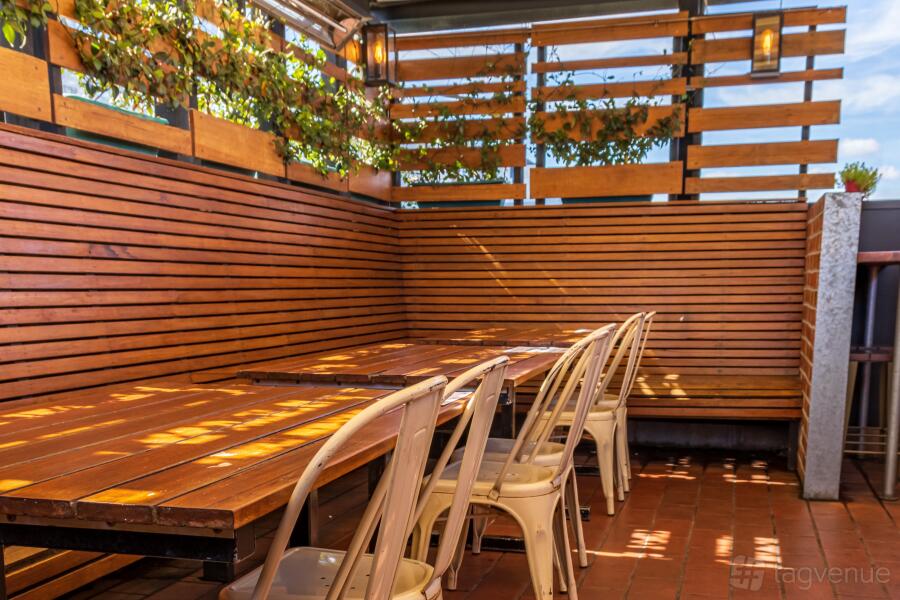 An intimate, private setting with closable glass entry doors, a private bar, and a charming beer garden, equipped with a TV and full AV access.