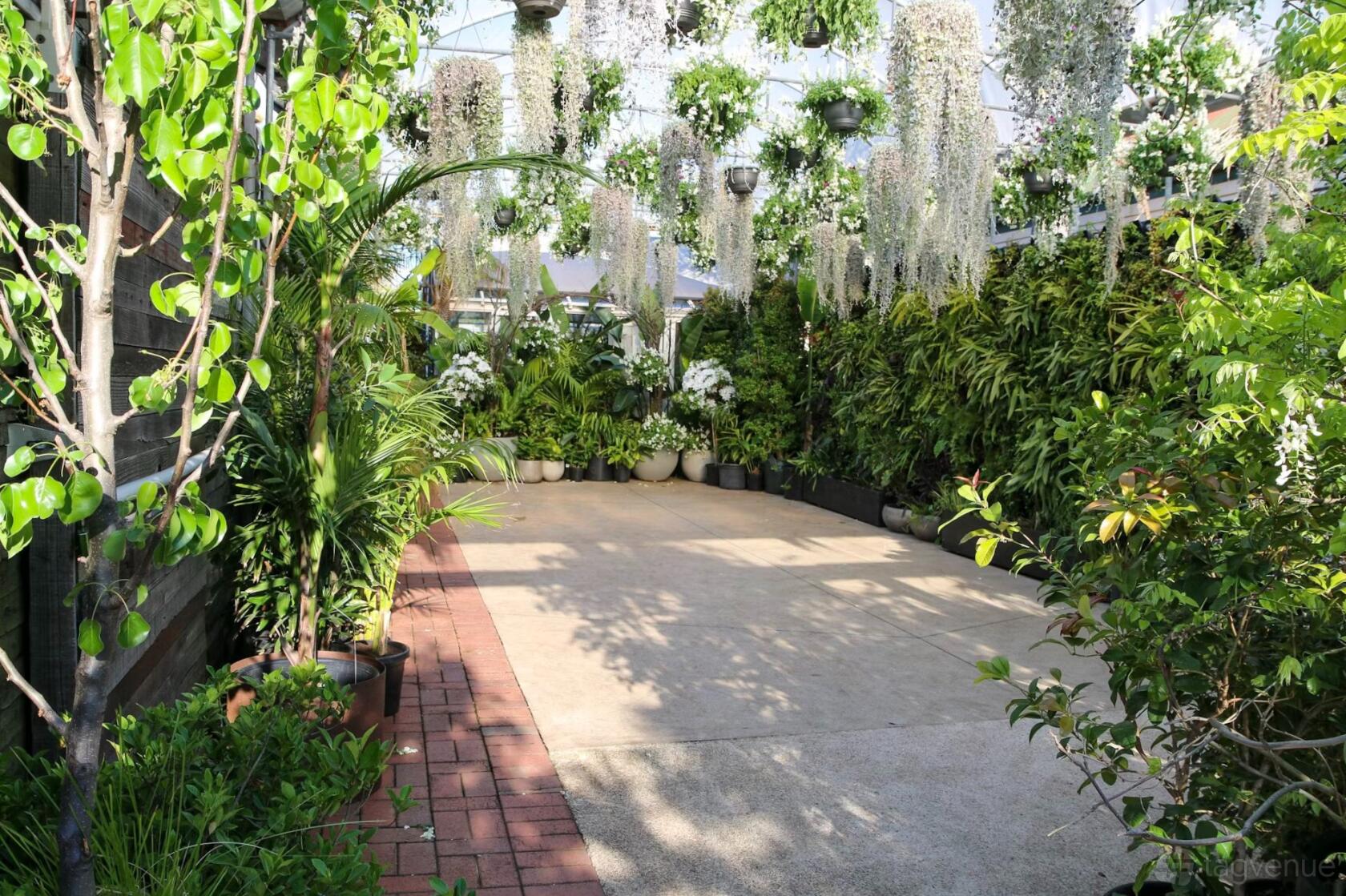 Glasshaus Outside, located at 52-54 Stanley St, Melbourne, is a unique, light-filled venue with a beautiful, natural setup that can hold up to 100 people standing or 70 seated. The space has impressive living green walls covered in lush plants. The decor includes simple wooden furniture that matches the natural surroundings, and large glass panels let in plenty of light, giving the venue an open, airy feel.