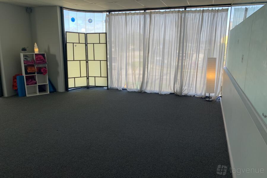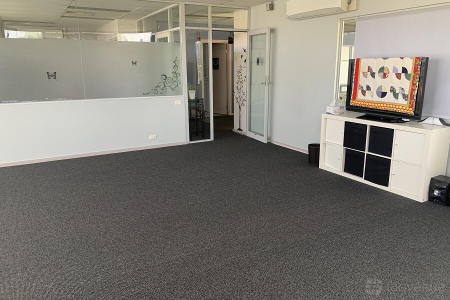 A decently sized training/workshop space which is carpeted, has a split system, lots of natural light, and up to 20 chairs. There are also a dozen yoga mats and cushions available, a TV to plug into, and a screen to use as a projector if needed. A lovely atmosphere – part of a wellness space!