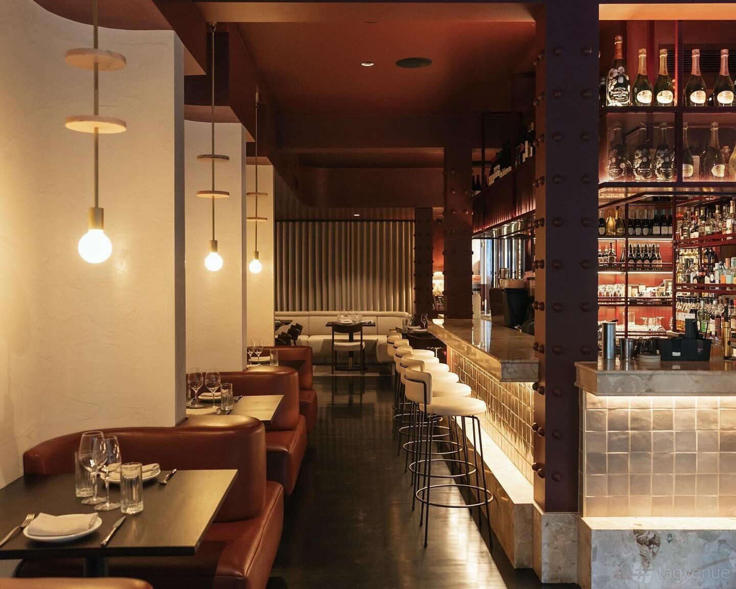 This 160-square-meter venue exudes modern sophistication, blending a stylish restaurant and bar with a warm, inviting ambiance. The dining area features plush upholstered chairs, chic booth seating, and elegant dark wood tables, offering both comfort and refinement. The bar, with its striking marble countertop and sleek high stools, provides a perfect spot for pre-dinner drinks or casual dining. Soft lighting and clean lines throughout create a relaxed yet upscale atmosphere, ideal for romantic dinners, lively social gatherings, or intimate corporate events.