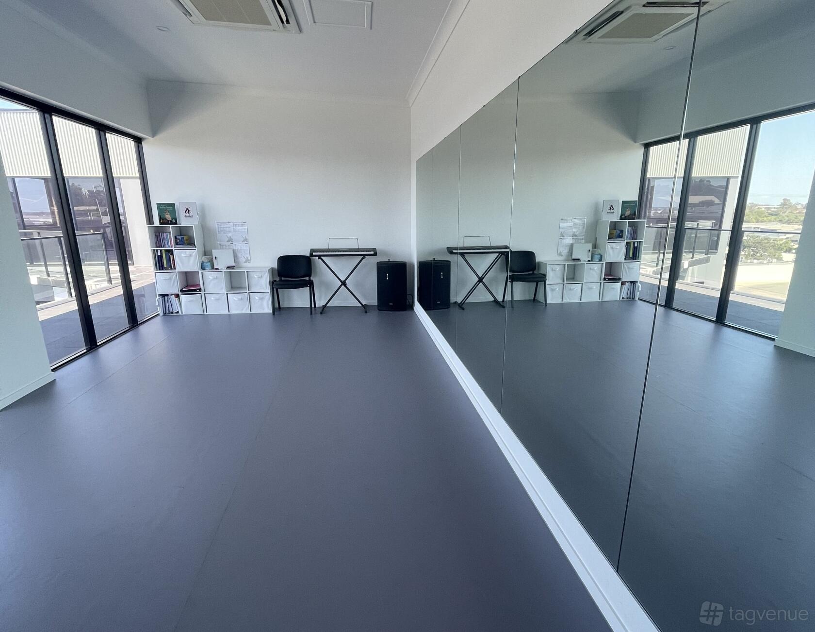 Looking for a professional space for a rehearsal? Studio 3 at Achieve Performing Arts Studio, located on Sumners Road in Sumner, offers an air-conditioned room with audio-visual equipment, including microphones, headsets, speakers, and an electronic keyboard. Full-length mirrors and wall windows provide natural light, while sprung flooring ensures comfort and safety.