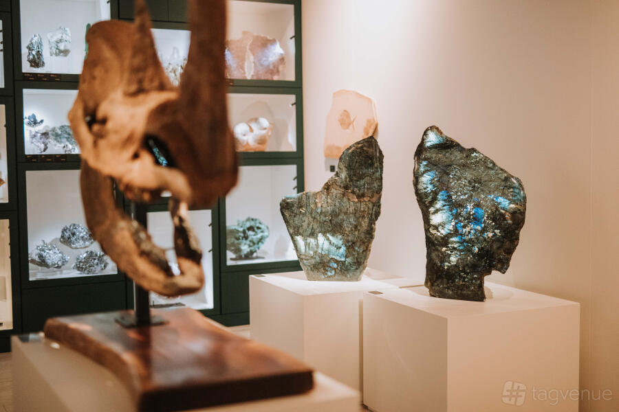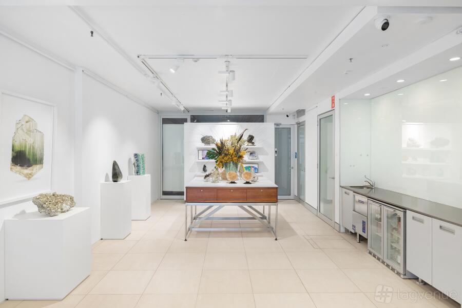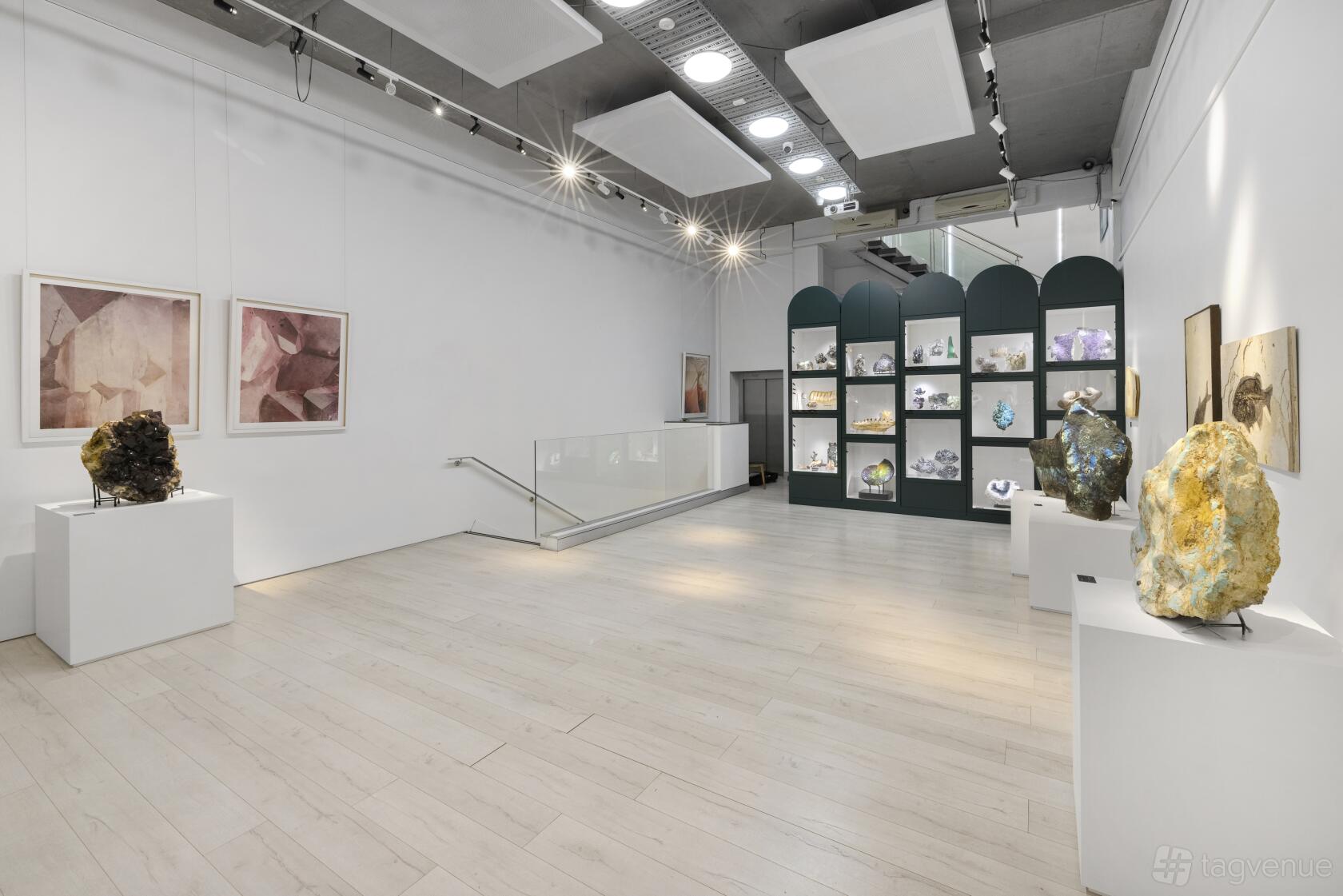 An atmospheric gallery space with towering ceilings and remarkable specimens of minerals, fossils, and crystals — designed for stylish events and memorable brand moments. AV setup, built-in projector, PA system, lighting, and lift access.