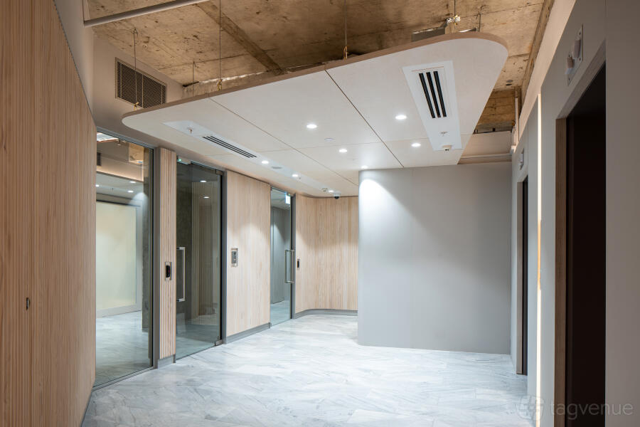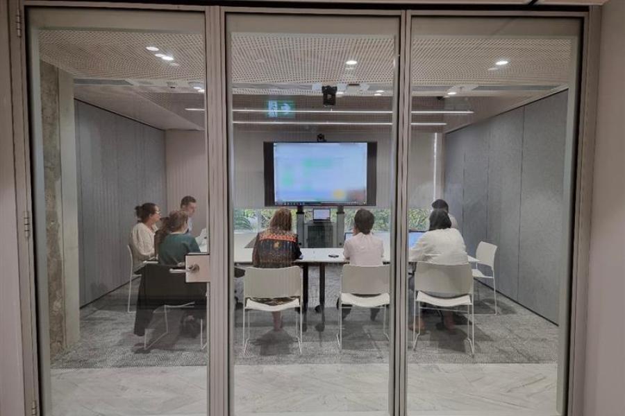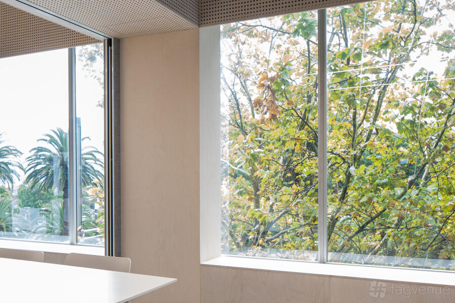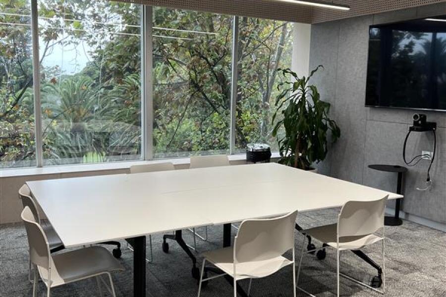 The space can be configured to comfortably accommodate 48 people in an auditorium configuration or 24 people in a boardroom setting. The abundance of natural light and views of the Sydney Royal Botanical Gardens will be enjoyed by the clients. Two 75" LED full HD screens are included in the space, and they can be synchronized to show the same content. High-tech video conferencing features on each screen include full HD cameras, surround sound speakers, and hypersensitive ceiling microphones. It is acceptable for visitors to bring their own devices, as long as they have HDMI/USB or Clickshare Technology installed.