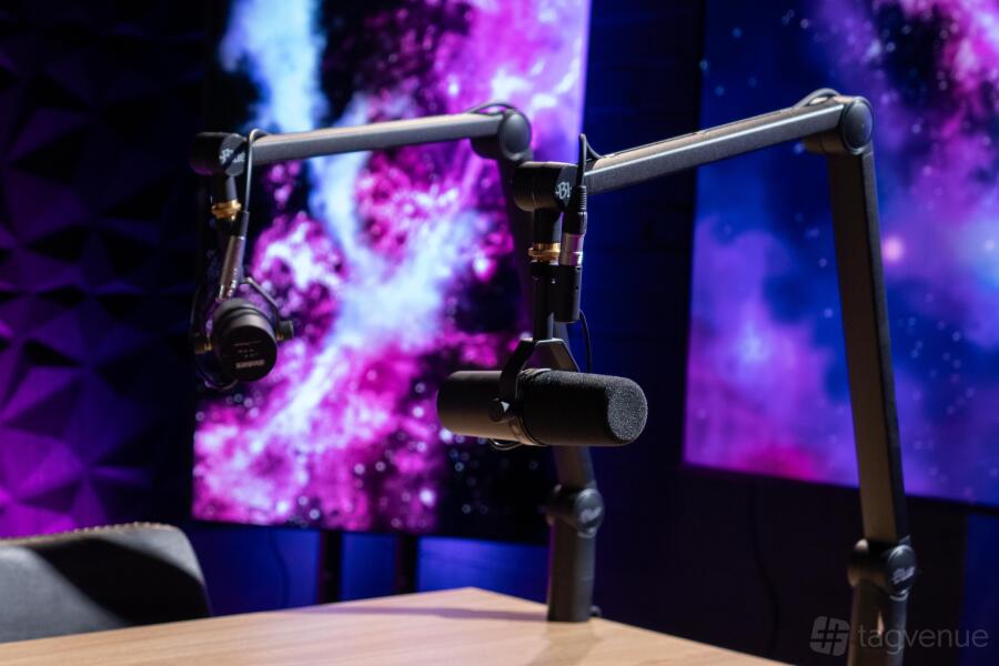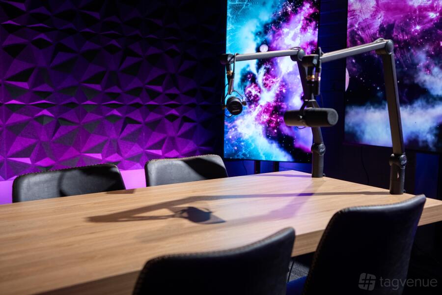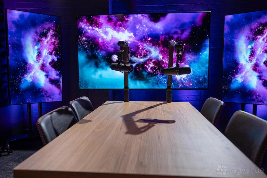Ideal for podcast recordings or hosting two people on camera for a polished video call, the space offers customizable lighting with digital displays and RGB color options to ensure a flattering appearance for everyone on camera.