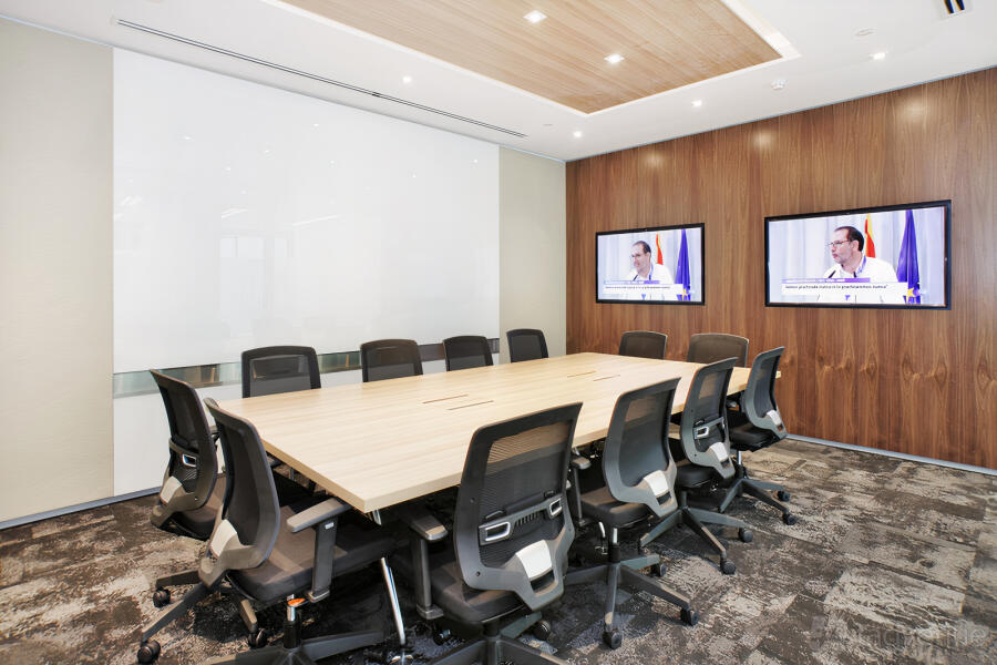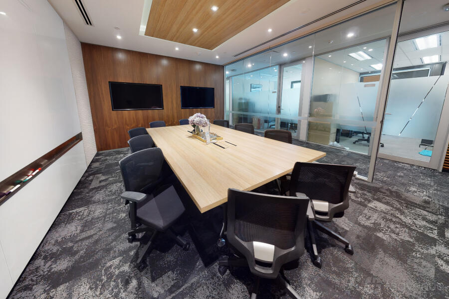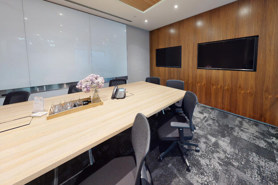 The walls are adorned with minimalist art and equipped with a large, flat-screen TV for presentations. Glass walls ensure the space is bathed in natural light, creating a bright and airy atmosphere. This meeting room includes high-speed internet and state-of-the-art teleconferencing facilities, ensuring seamless connections for all business needs.